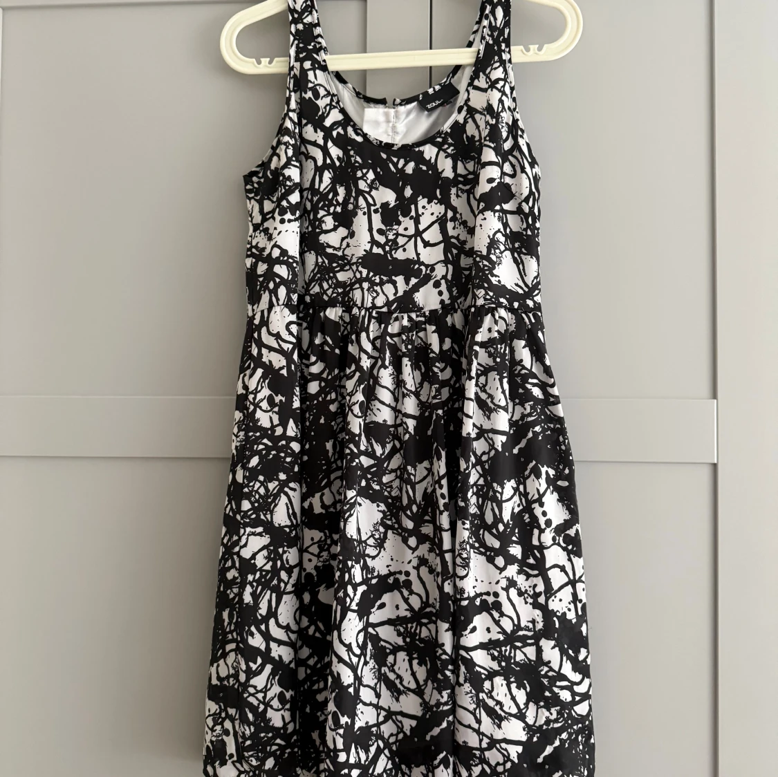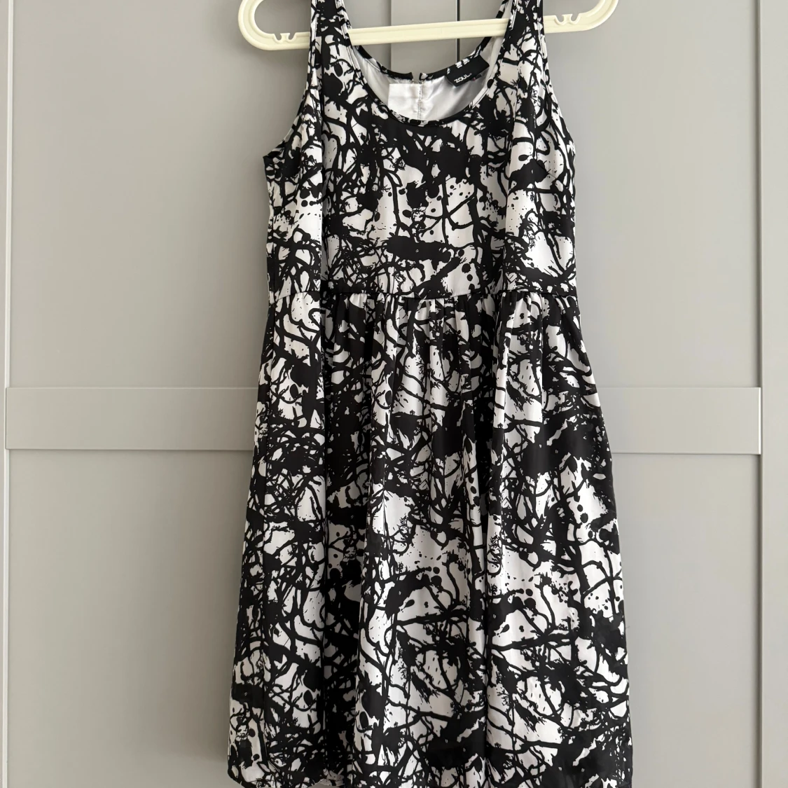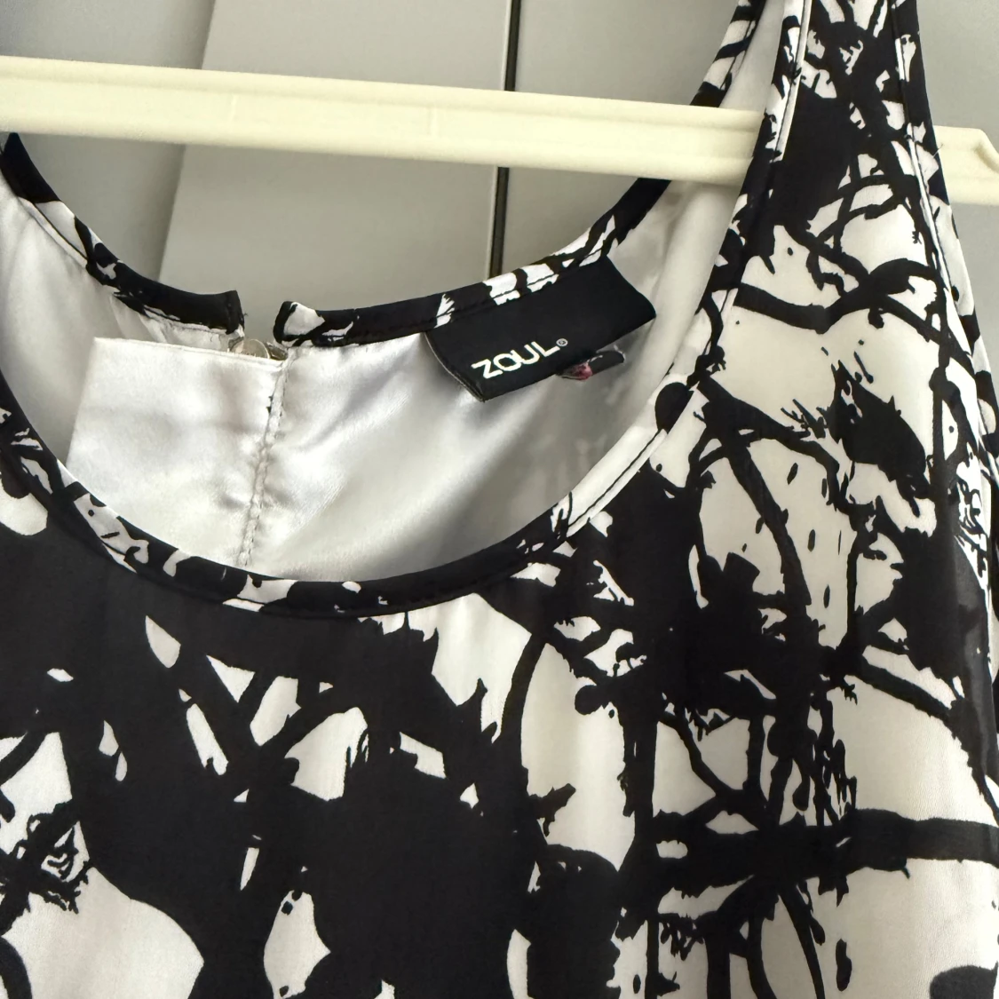 Cool svartvit klänning från Zoul med abstrakt mönster och rund halsringning. Modellen är ärmlös och har en markerad midja samt dragkedja i ryggen. Materialet är glansigt och känns lyxigt, perfekt för dig som gillar att sticka ut.