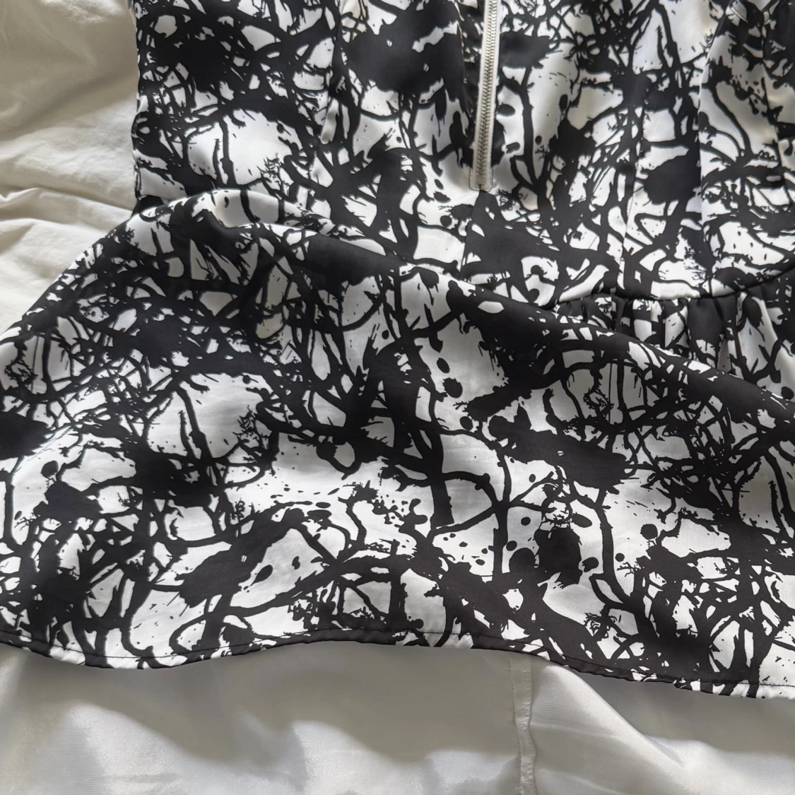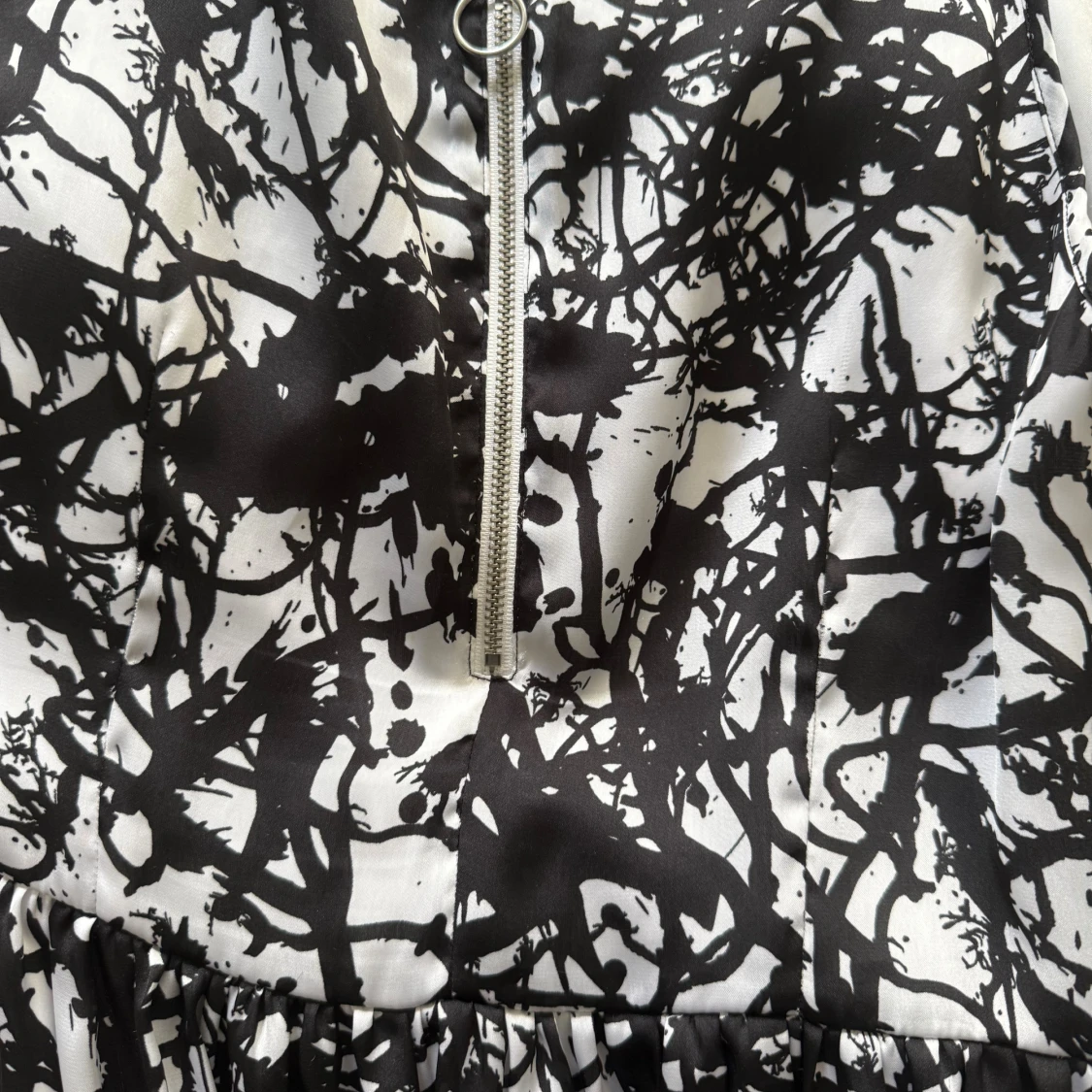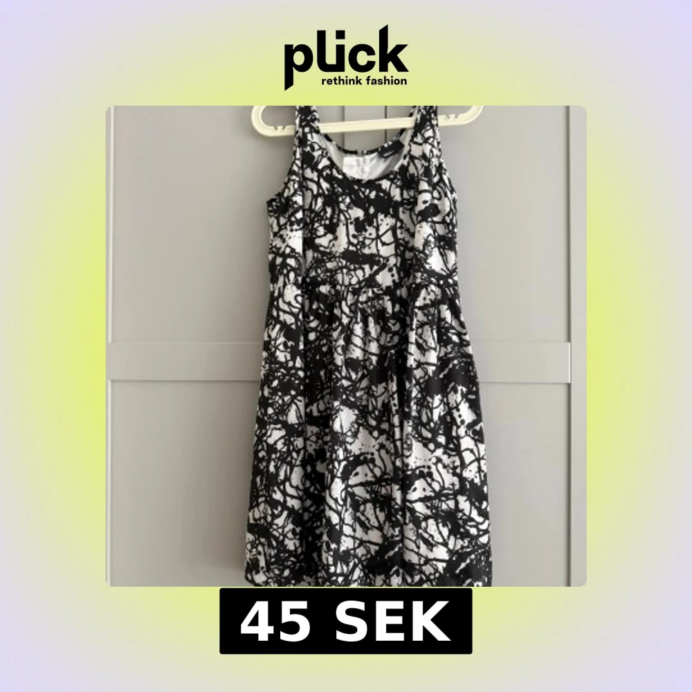 Cool svartvit klänning från Zoul med abstrakt mönster och rund halsringning. Modellen är ärmlös och har en markerad midja samt dragkedja i ryggen. Materialet är glansigt och känns lyxigt, perfekt för dig som gillar att sticka ut.