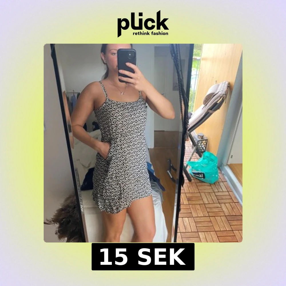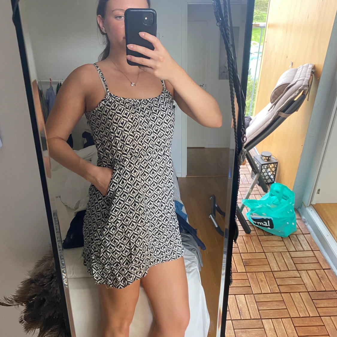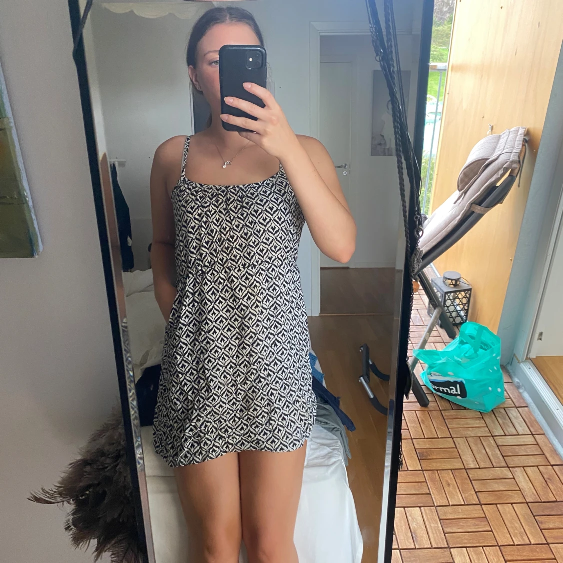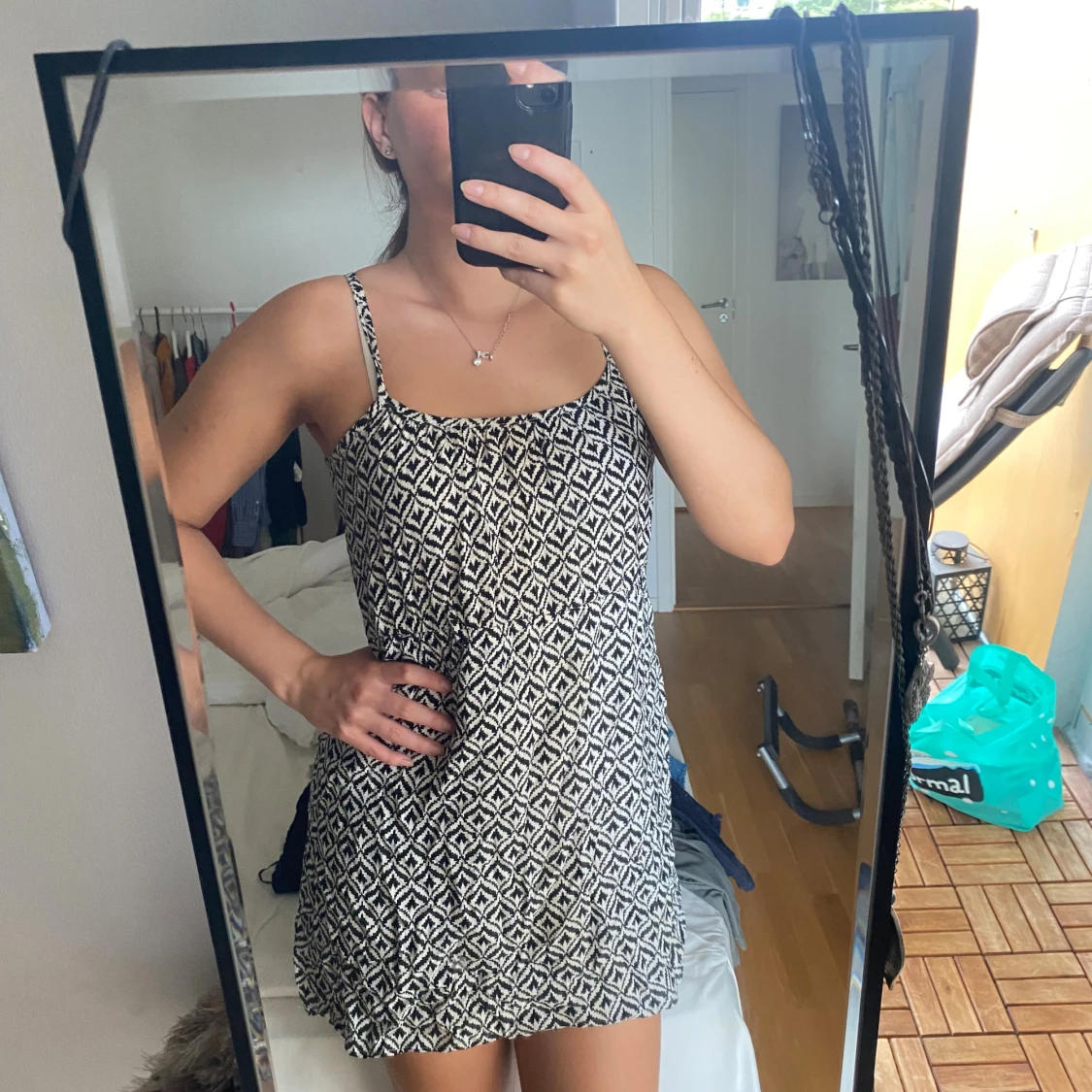 Supersöt kort klänning med svartvitt geometriskt mönster och tunna axelband. Lätt och luftig modell som sitter skönt och har en avslappnad passform. Perfekt för varma dagar och enkel att styla med sneakers eller sandaler.