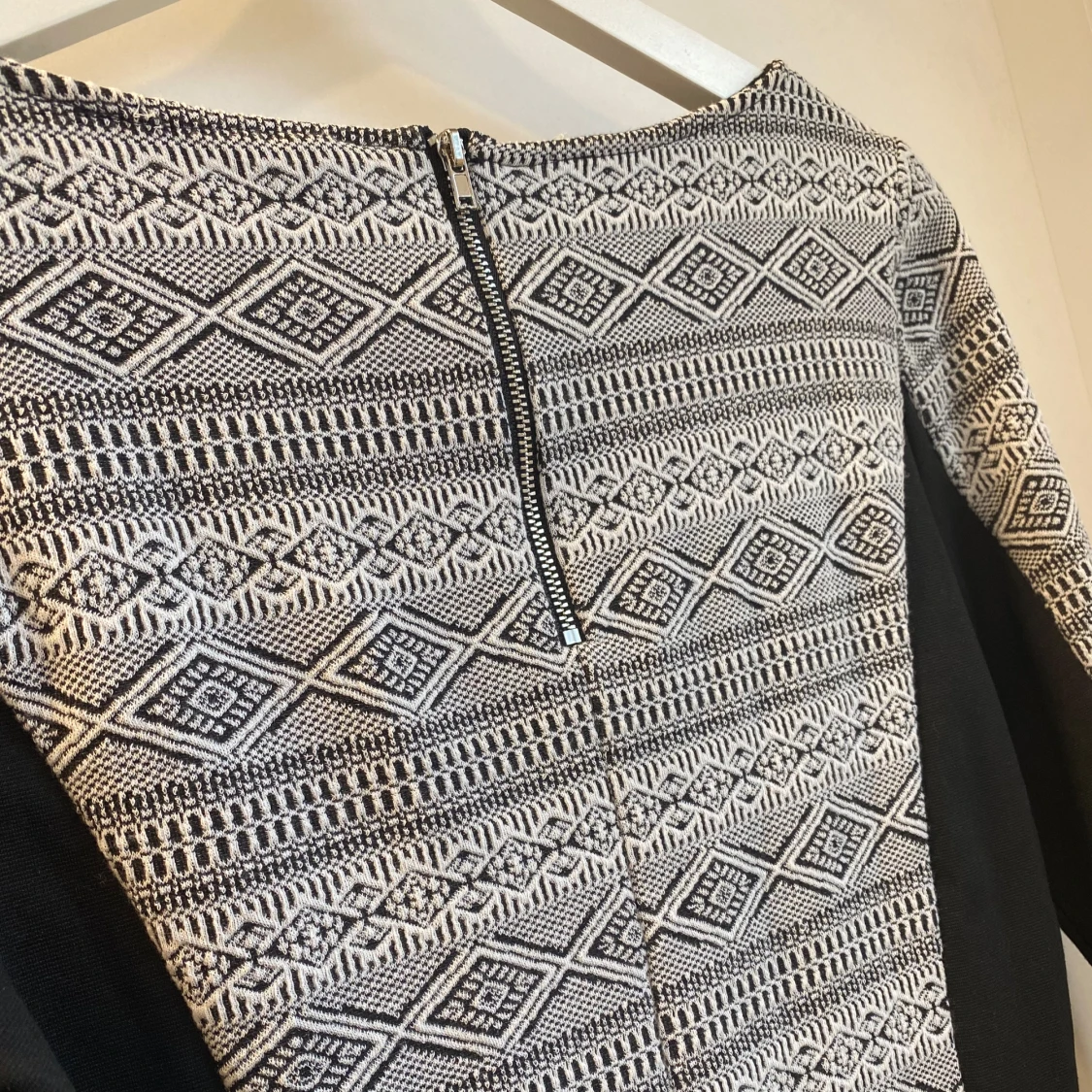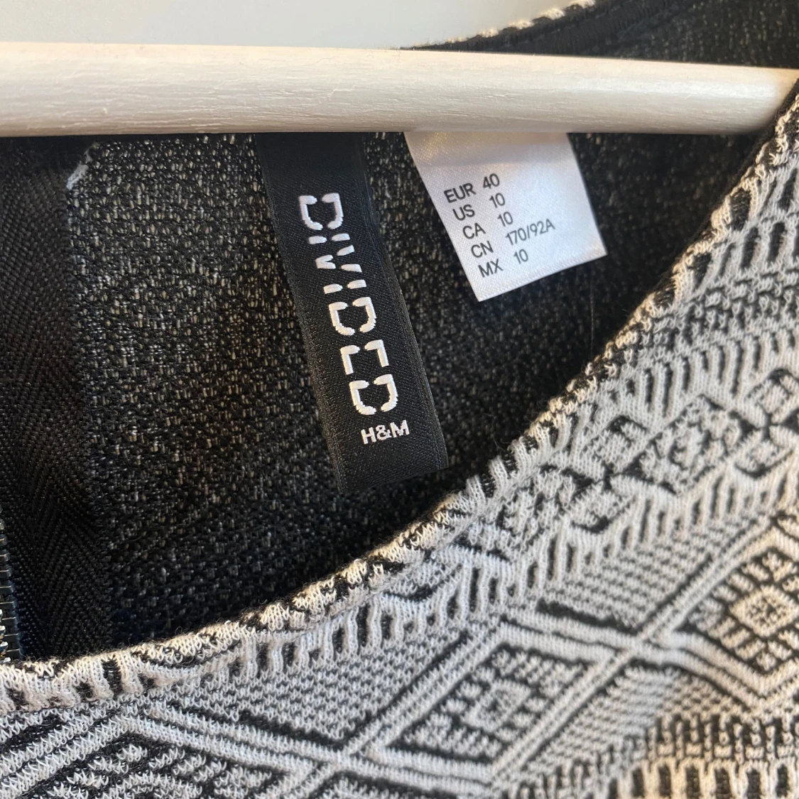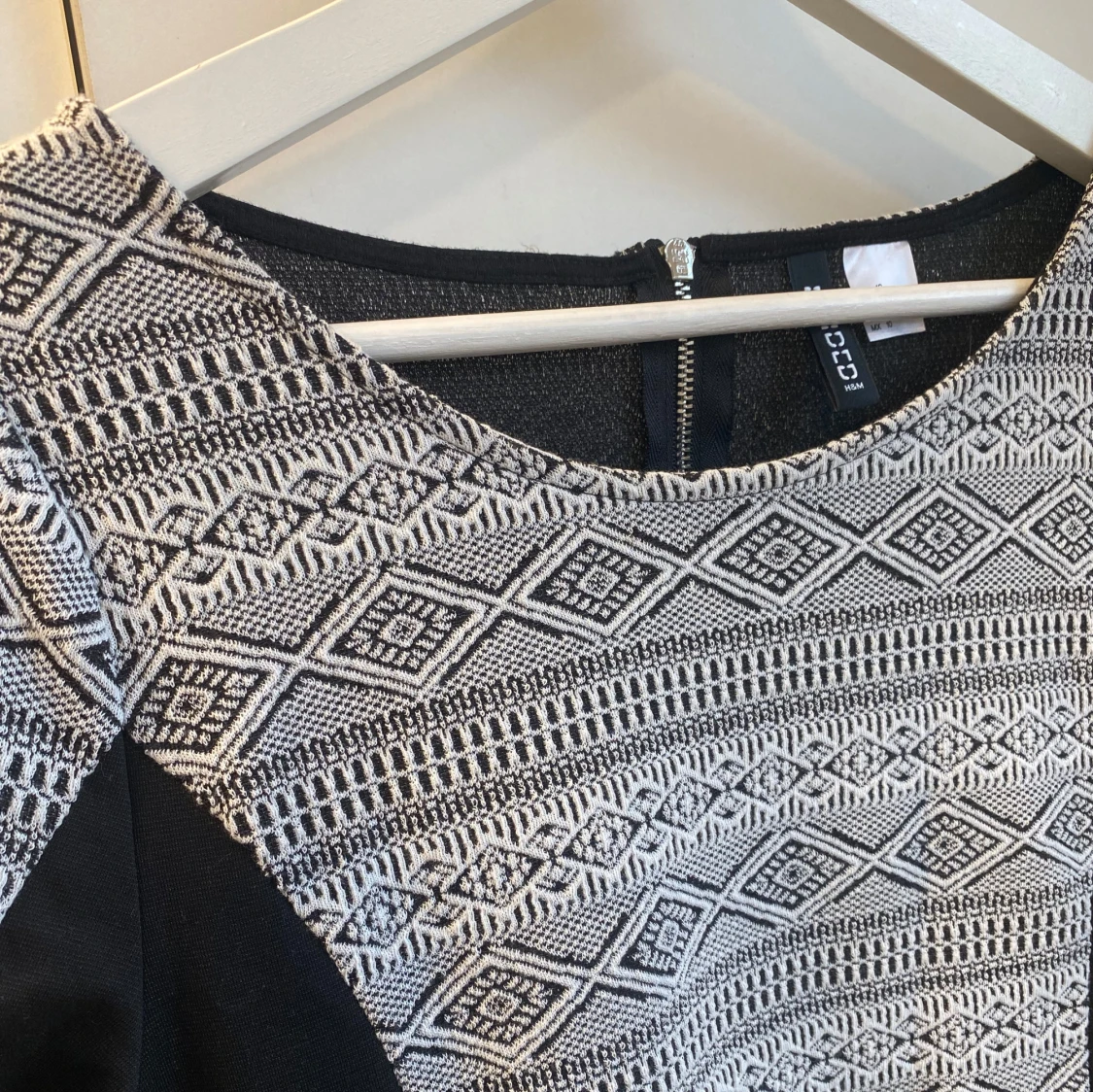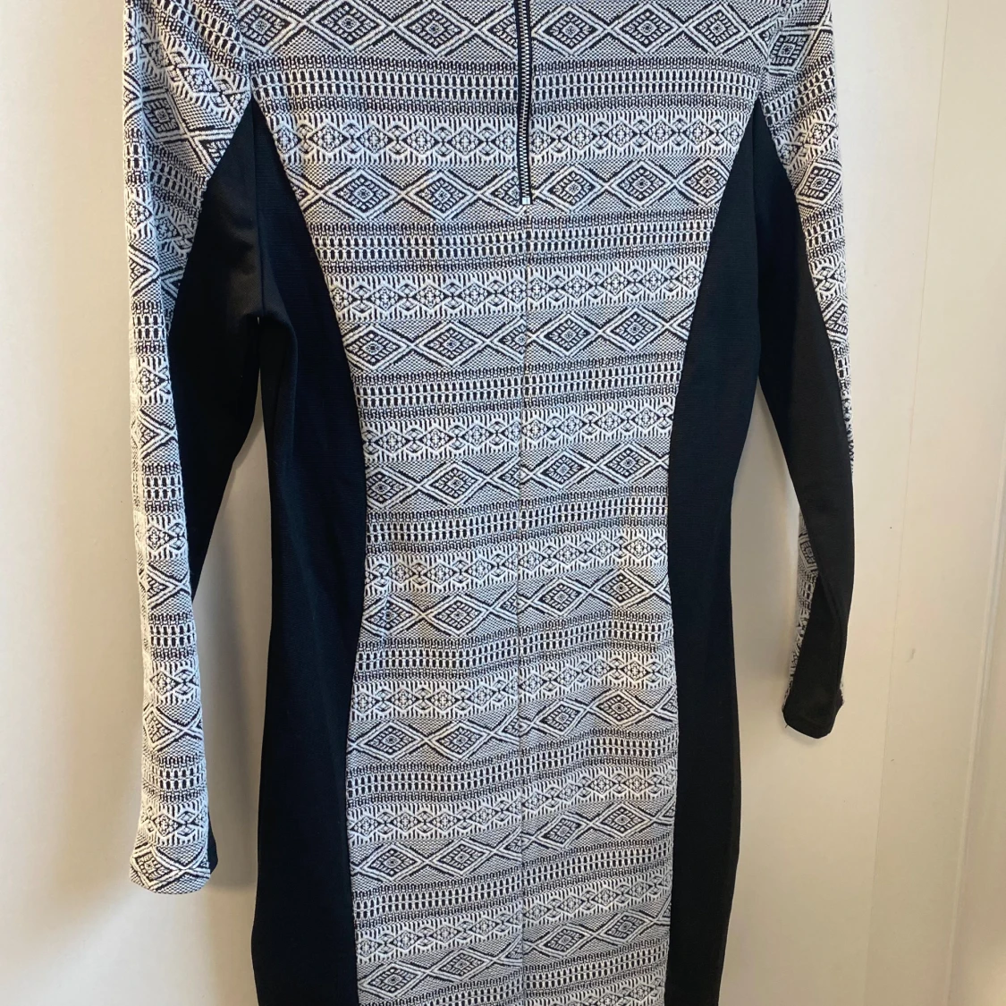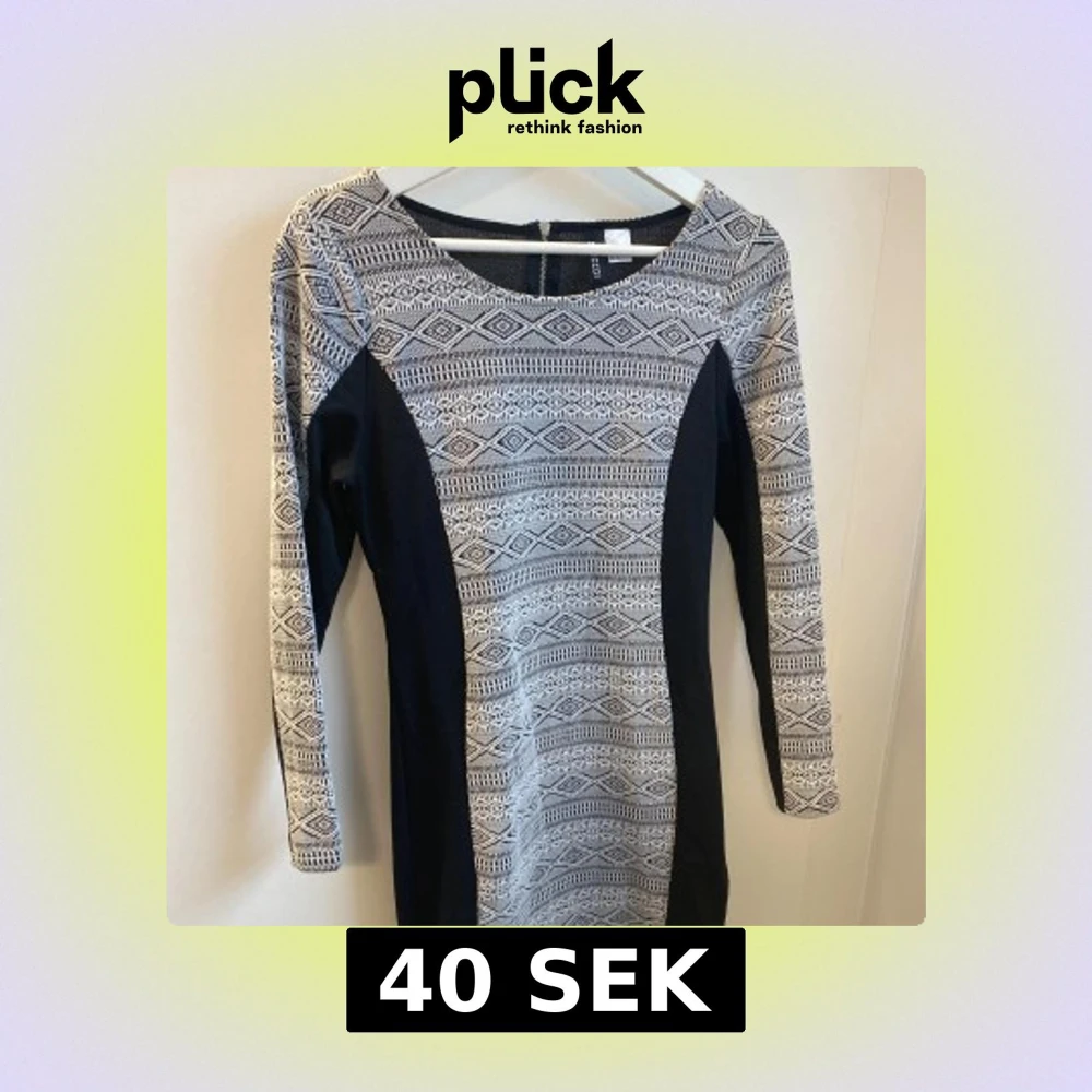 Snygg svartvit klänning från H&M med grafiskt mönster och lång ärm. Klänningen har figurnära passform, dragkedja bak och är tillverkad i ett stretchigt material som sitter bekvämt. Perfekt för dig som gillar stilrena kontraster och coola detaljer.