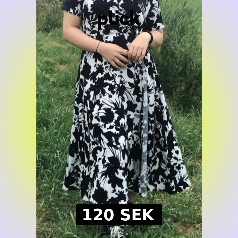 Säljer en svartvit omlottklänning med blommigt mönster. Klänningen har v-ringning, knyt i midjan och korta ärmar. Tyget är mjukt och stretchigt. Perfekt för dig som gillar en flowy och bekväm stil. Kläningen har inga skador och använd bara ett par gånger.