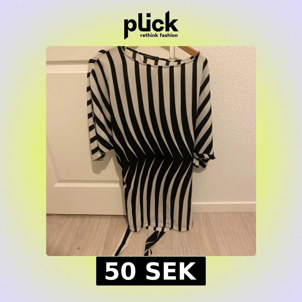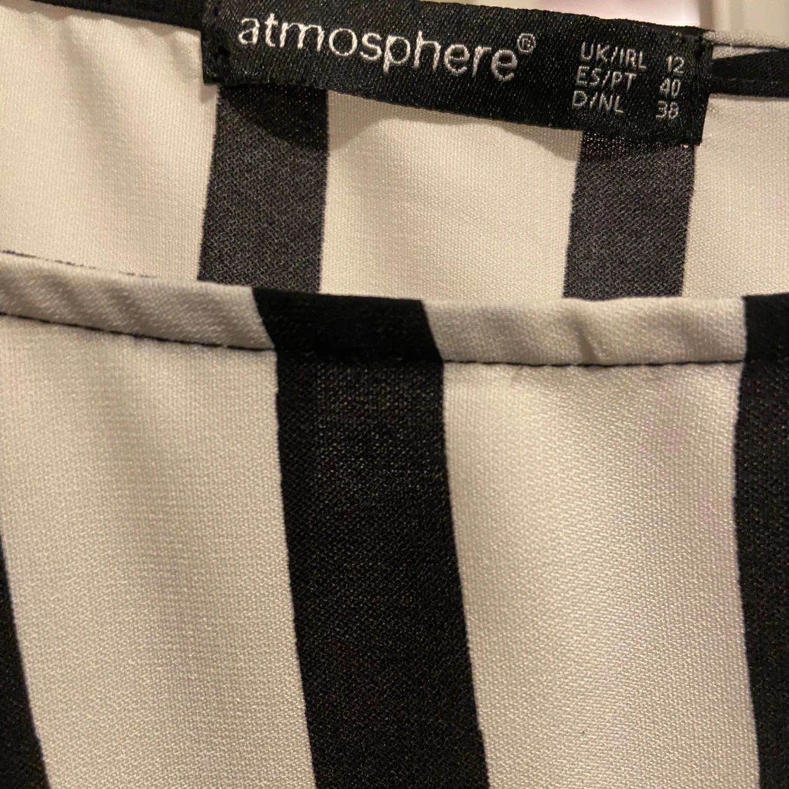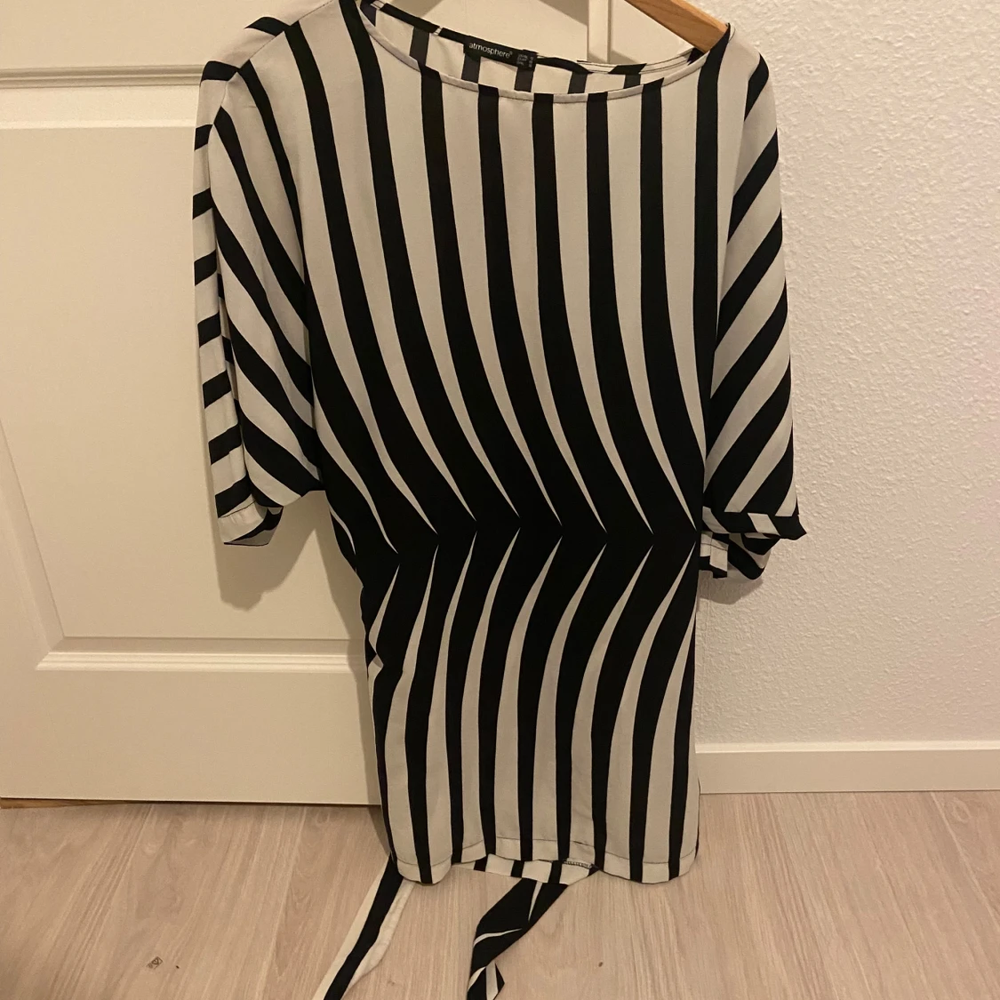 Säljer en stilren svartvit randig klänning från Atmosphere. Klänningen har trekvartsärmar och ett knytband i midjan för en snygg passform. Perfekt för en chic look!