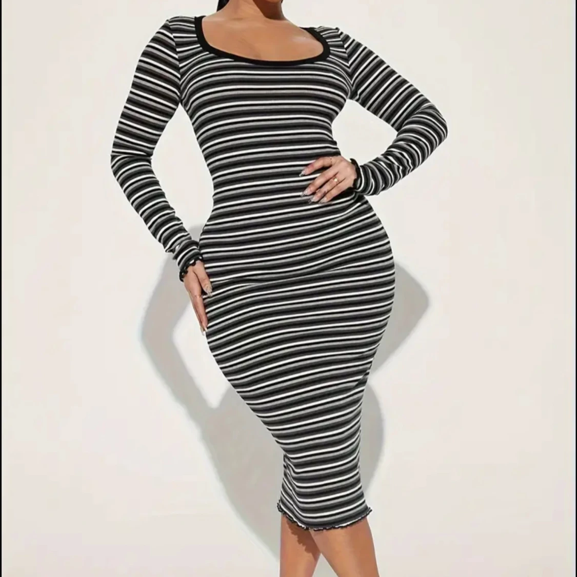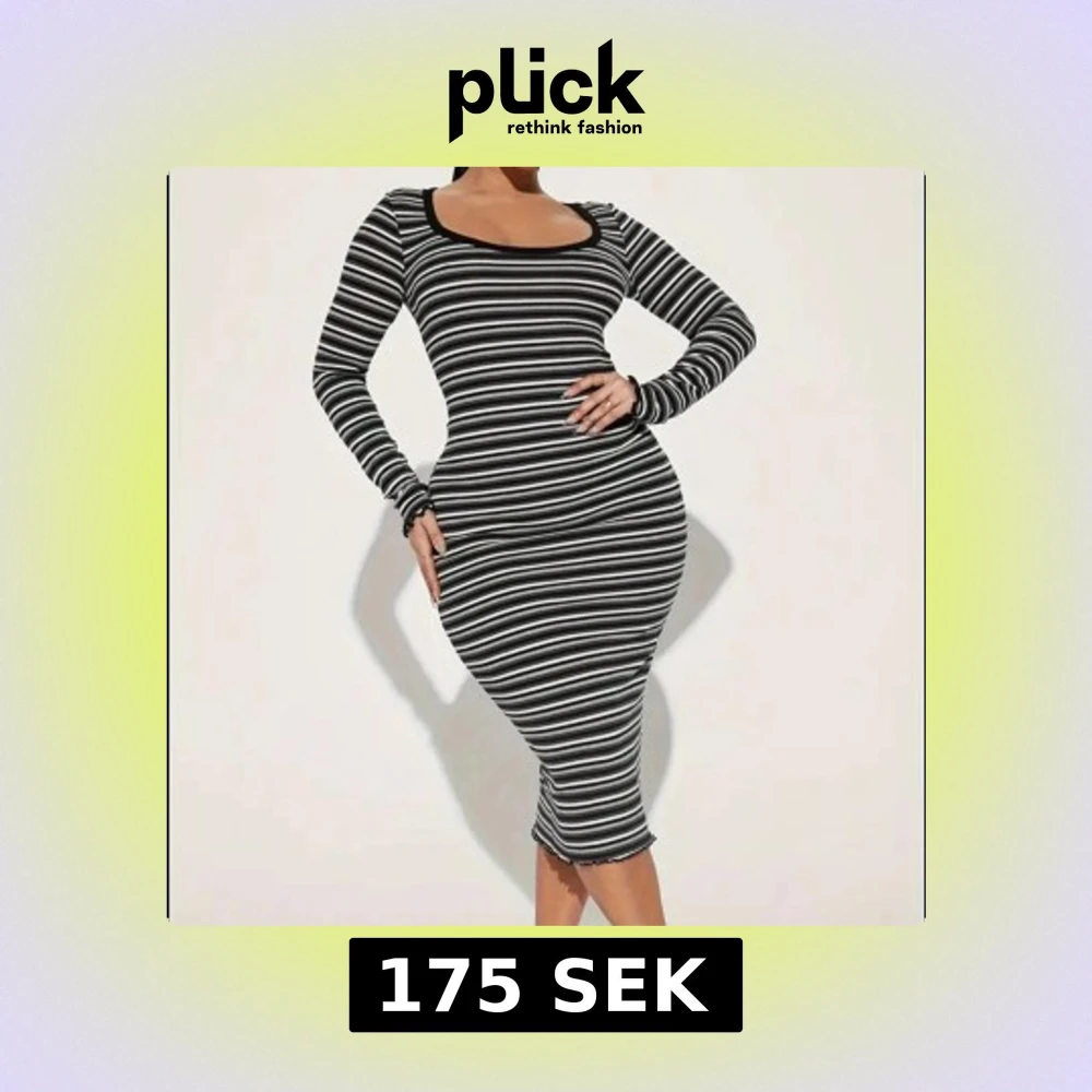 Säljer en svartvit randig klänning med lång ärm och rundad halsringning. Klänningen är figurnära och har en midilängd som framhäver siluetten. Perfekt för dig som gillar en stilren look med lite edge. Materialet är mjukt och stretchigt för skön passform.