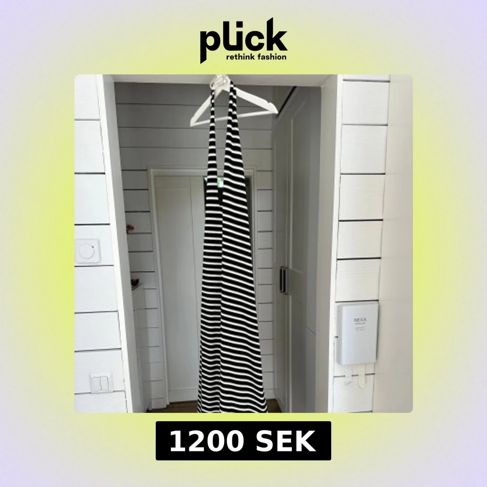 Säljer en svartvit långklänning med smala axelband och djup v-ringning. Klänningen har ett coolt randigt mönster och är tillverkad i ett mjukt, ribbat material som ger en snygg passform. Perfekt för dig som gillar en stilren och trendig look. Tillhörande halssmycke kommer med.
