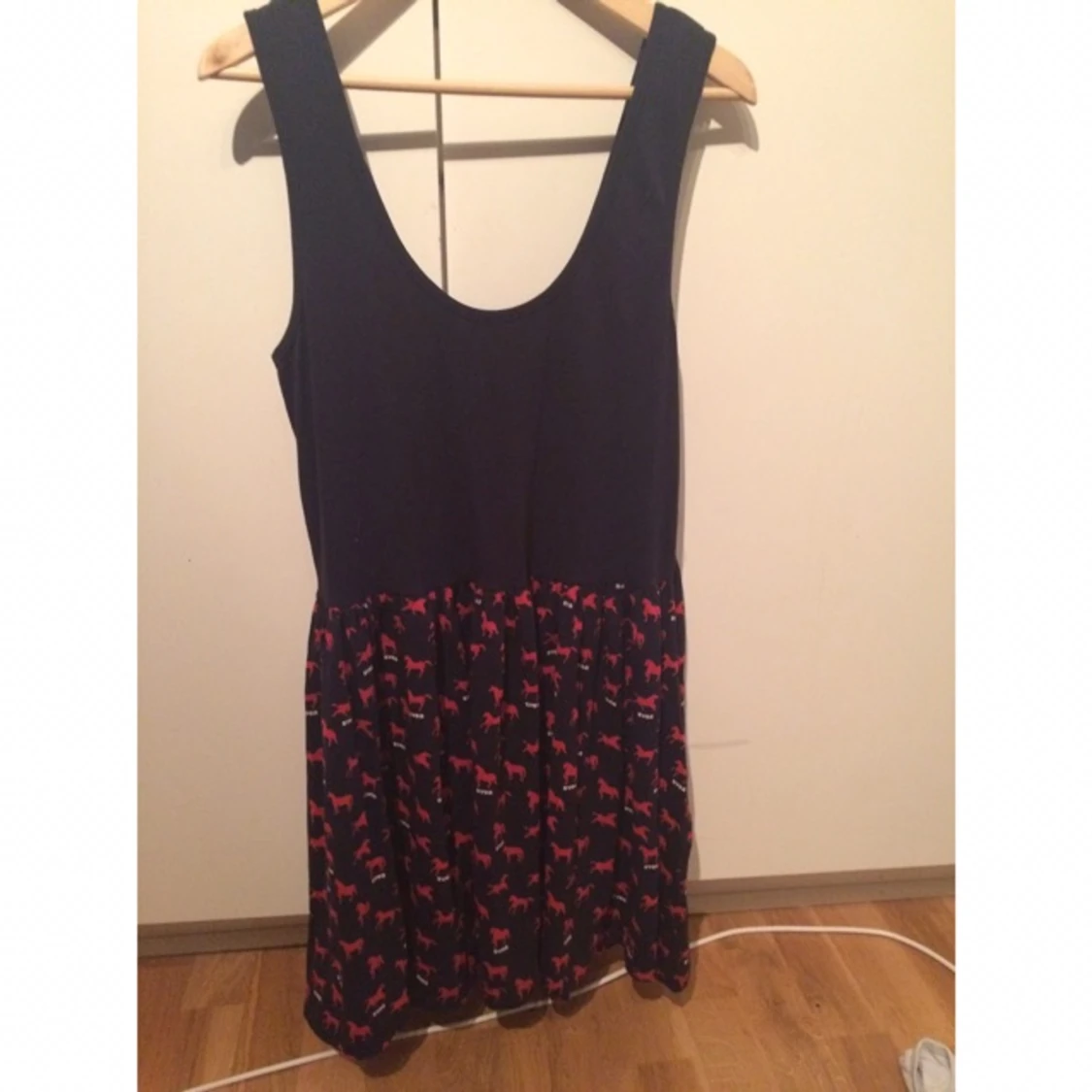 Marinblå klänning med dragkedja i ryggen med hästmönster på kjol delen. Använd 2 gånger. OBS! Ska plagget fraktas står köparen för den här kostnaden