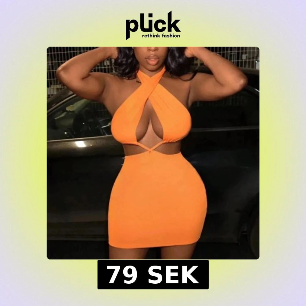 Säljer två snygga korta klänningar. Ena är helorange med korsad halterneck och cut-out detaljer,(finns i blå och svart) andra har färgstarkt mönster i orange, gul och blå toner med ringdetalj framtill. Båda är tighta och ärmlösa, perfekta för dig som vill sticka ut.