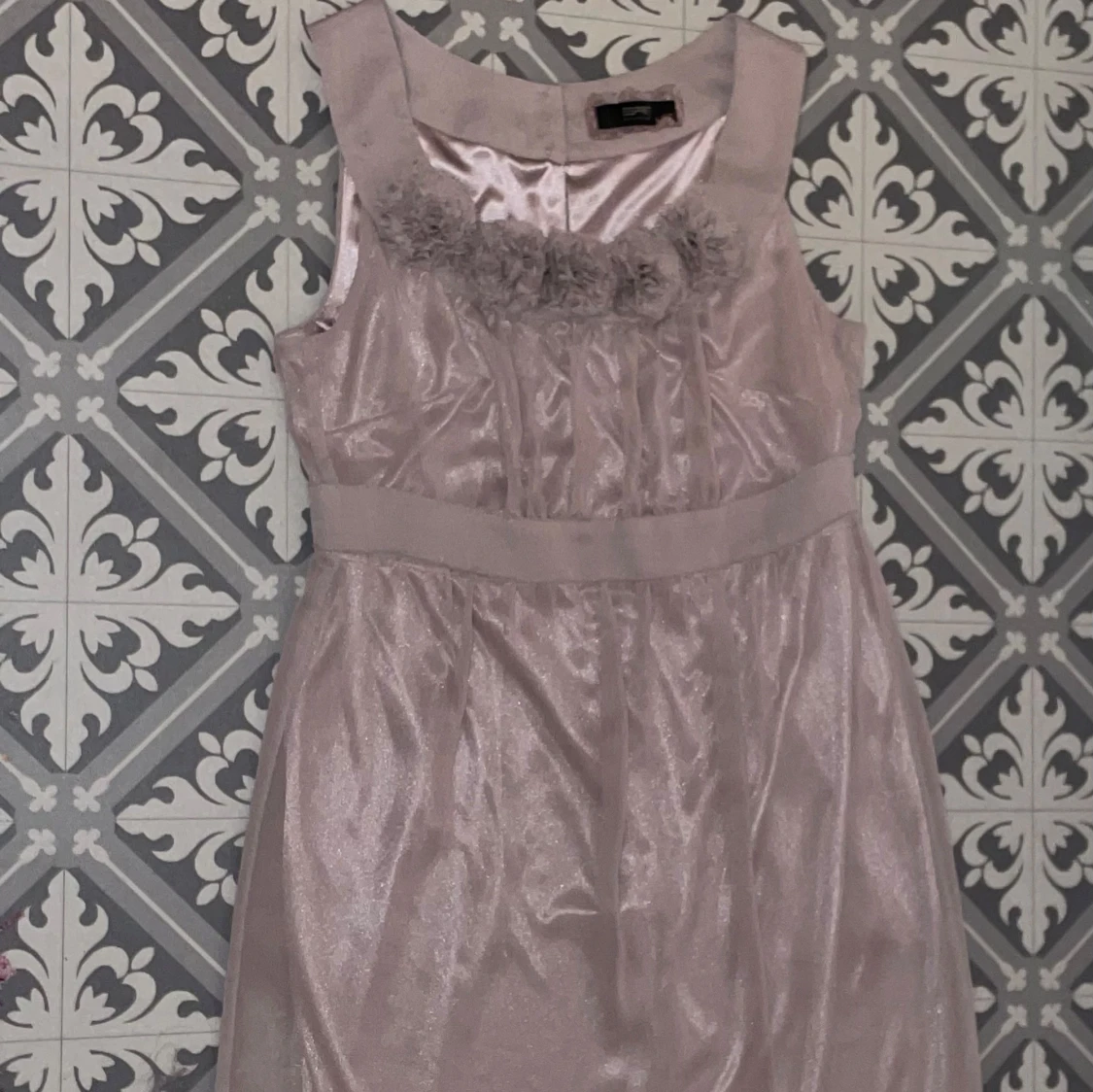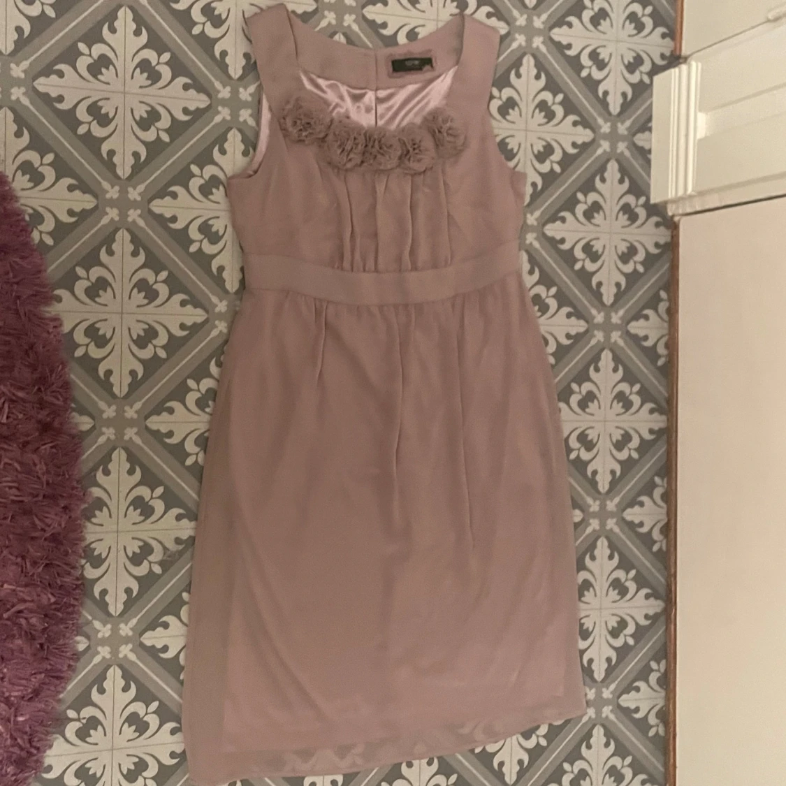 Säljer en ny ljusrosa klänning från Esprit. Den är ärmlös med blommiga detaljer vid halsringningen och har en mjuk, glansig finish. Perfekt för speciella tillfällen! 🌸