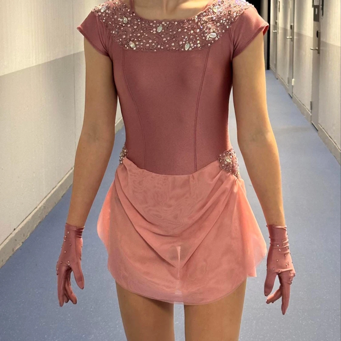 Handgjord konståknibgsklänning som bara har används vid en tävling. Mått: Stuss:96cm Midja: 65cm Byst: 84cm Armlängd: 15cm Kjollängd: 46cm, motsvarar xs-s. Den är stretching i materialet så dina mått behöver inte vara identiska för att den ska passa. Handskar samt hår accessoar följer med. Köpt för 3000kr
