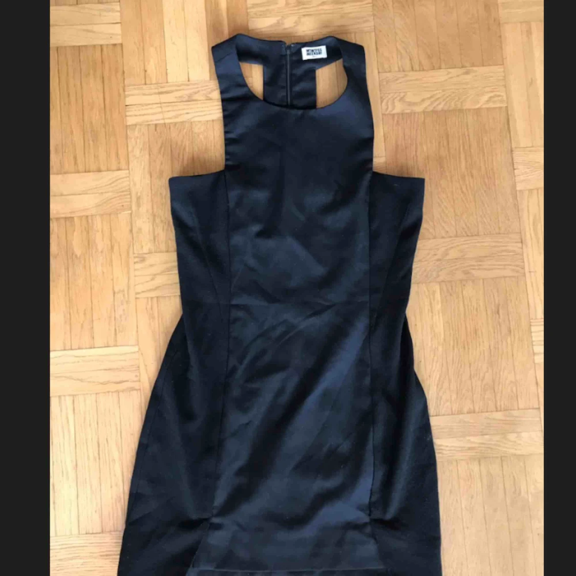 Svart kort tight klänning från Weekday. Kortare framtill och olika typer av tyg i sidorna mot rygg och framtill. Dold dragkedja i ryggen.