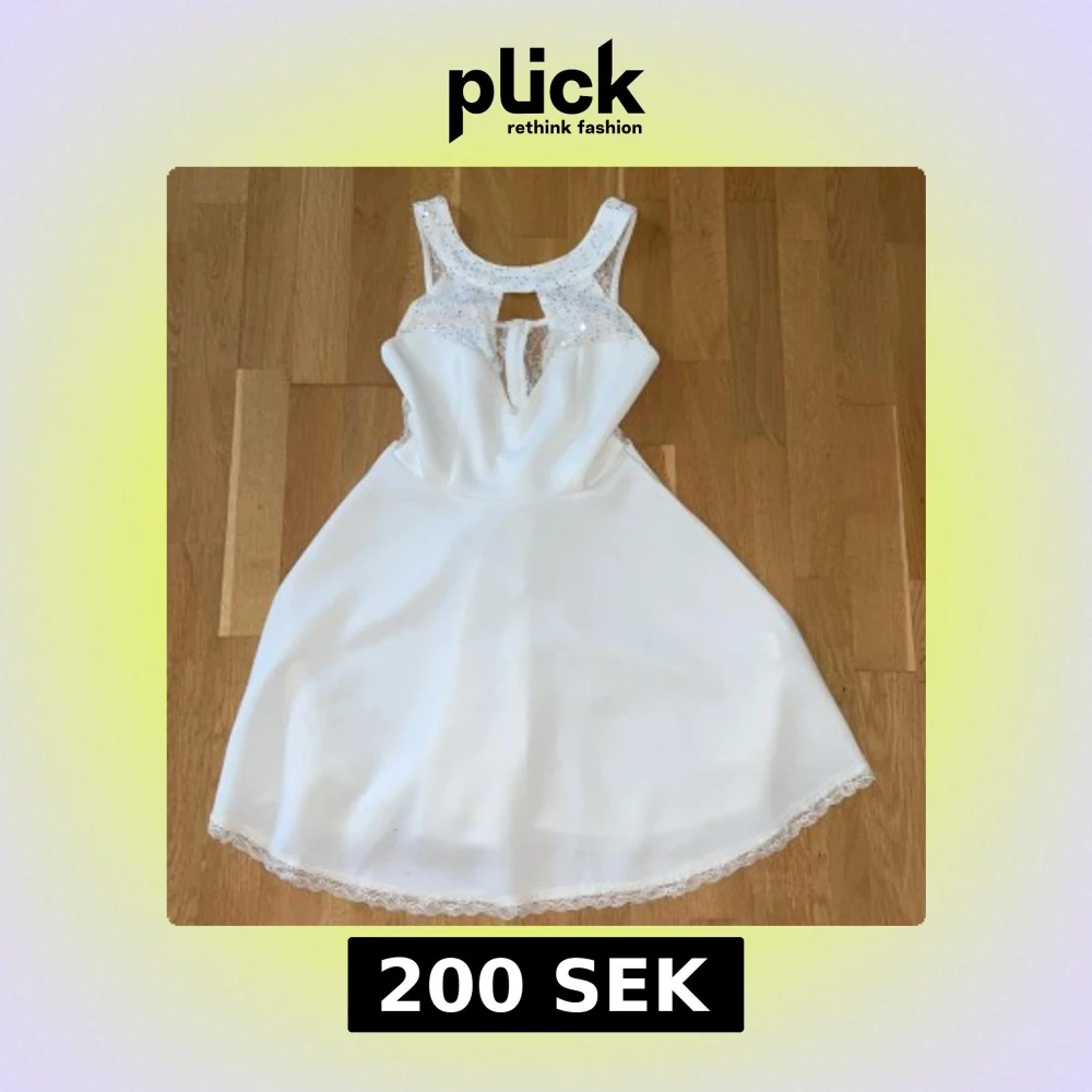 Supersöt vit klänning med glittriga paljetter upptill och transparent mesh vid axlarna. Klänningen har en snygg öppning fram och bak, samt spetskant längst ner på kjolen. Passar dig som gillar en feminin och festlig stil med lite extra bling.