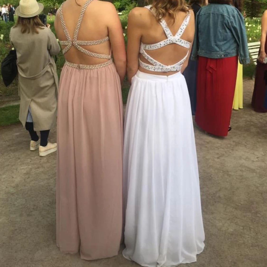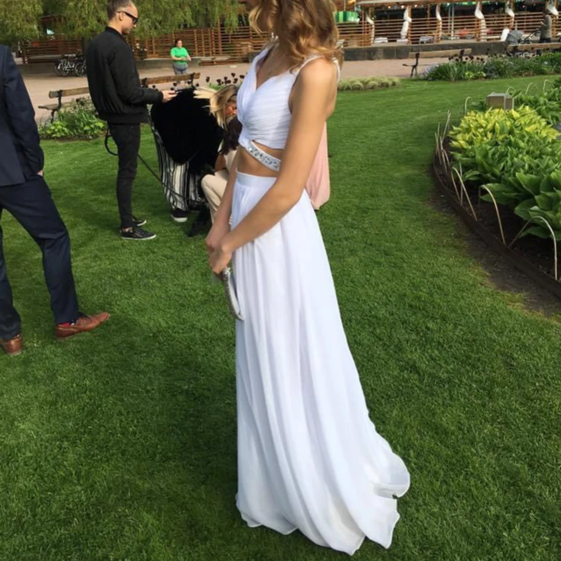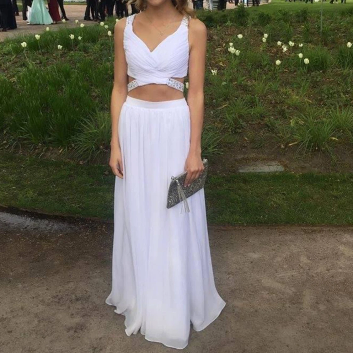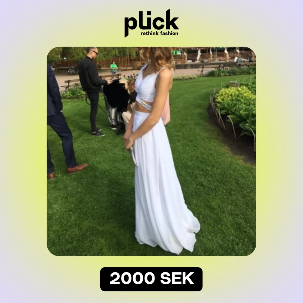 Vit tvådelad balklänning. Passar storlek XS-XXS. Både toppen och kjolen är insydda hos skräddare, så det går att fixa om man vill göra de större.
