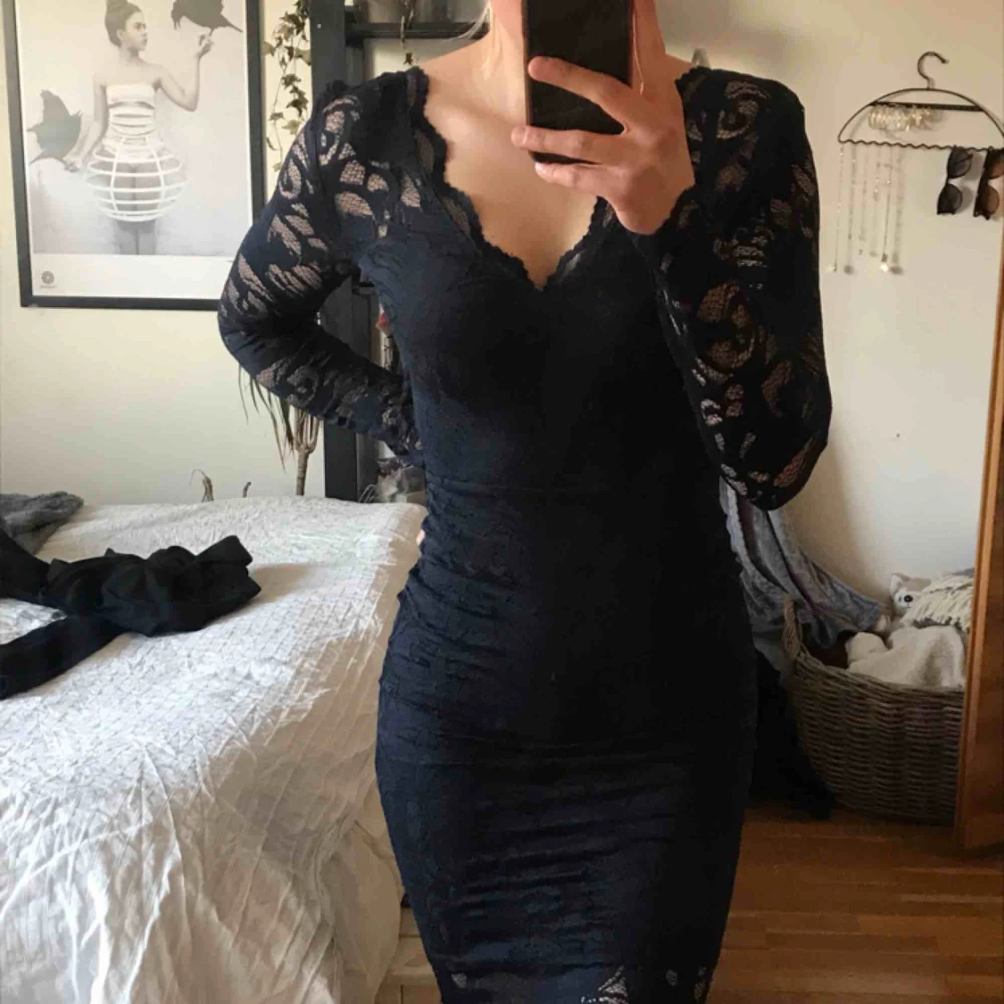Marinblå spets klänning från hm. Den är figursydd vilket gör att den sitter snyggt på kroppen! Storlek 34/XS men väldigt strechigt material så den passar nog 38/S (som mig) Köparen står för frakt!