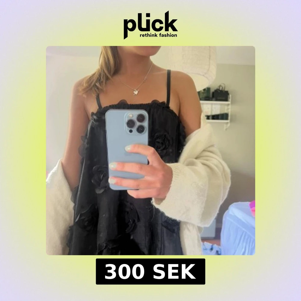 Supersöt svart kortklänning med tunna axelband och dekorativa blommor över hela klänningen. Passar till allt!