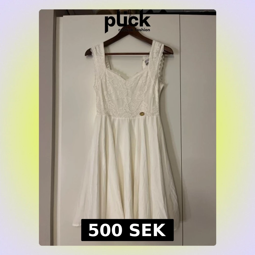 Söt vit klänning med spetsdetaljer upptill och v-ringad hals. Kjolen är lätt utsvängd och klänningen har en dekorativ dragkedja i ryggen. Perfekt för sommarens alla tillfällen. Materialet känns som bomull och spets. Klänningen är från Bubbelrooms studentklännings kollektion från några år tillbaka och är i storlek Xs. Enbart använd en gång