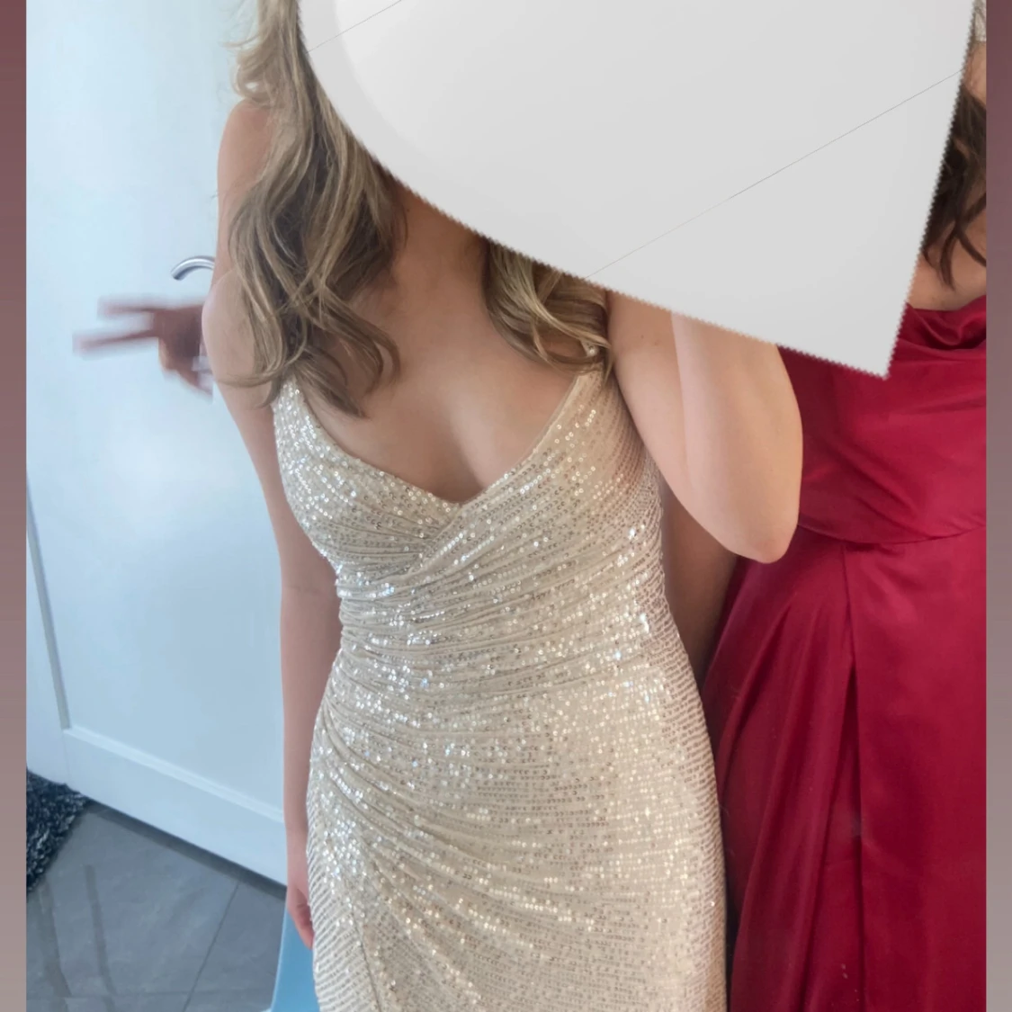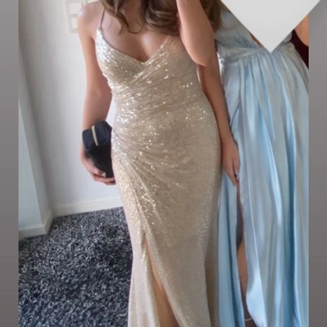 Supersnygg lĂ„ngklĂ€nning i champagnefĂ€rg med glittriga paljetter, smala axelband och v-ringad omlottfront. Första bilden Ă€r lĂ„nad de andra tvĂ„ Ă€r mina! KlĂ€nningen endast anvĂ€nd en gĂ„ng och Ă€r uppsydd sĂ„ den ska passa nĂ„gon som Ă€r ca 155cm. Kom privat för frĂ„gor och fler bilderđ