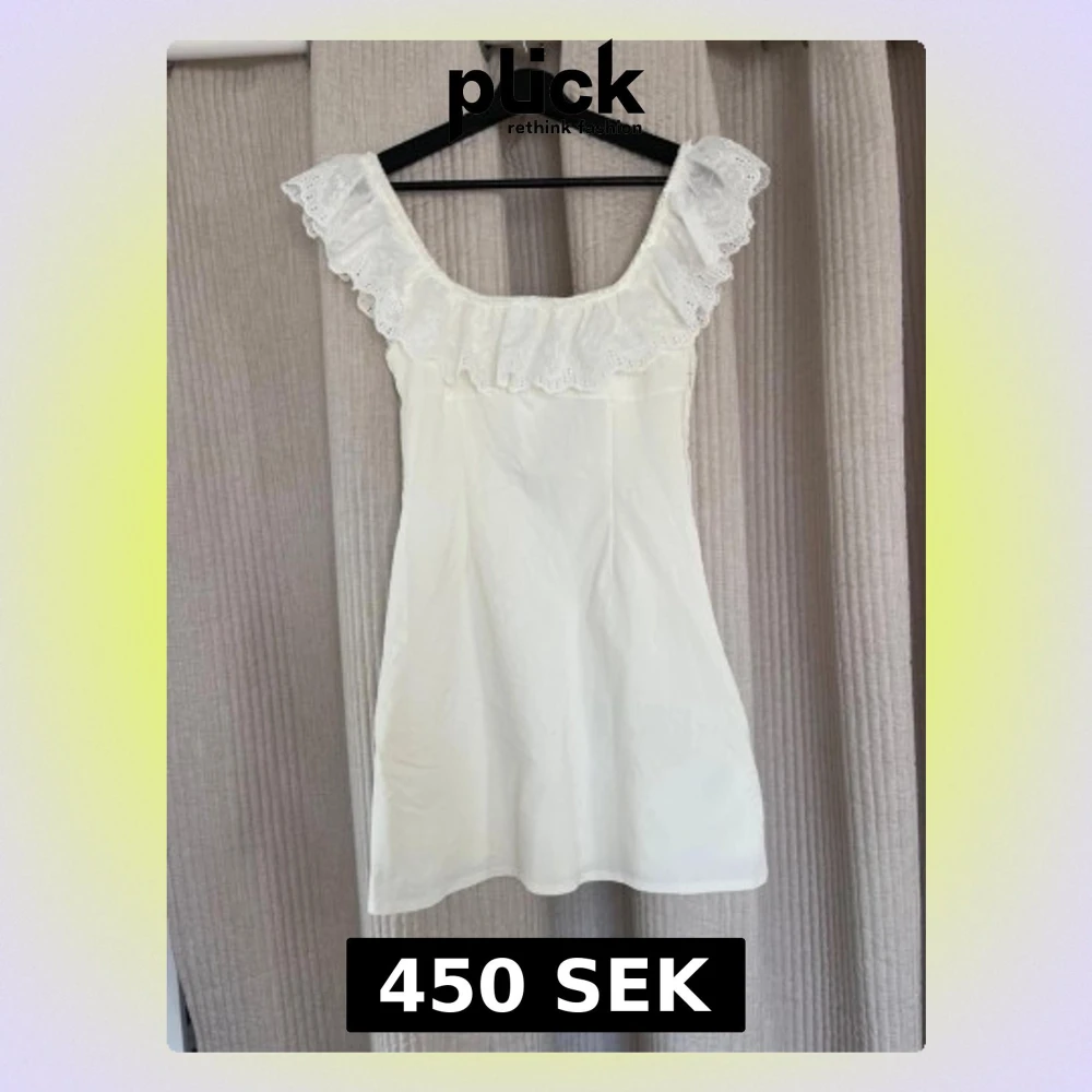 Supersöt vit kort klänning med bred spetsvolang runt axlarna och en liten rosa rosett framtill. Klänningen har en feminin och romantisk stil, är ärmlös och har en lätt A-linjeform. Perfekt för sommarens alla tillfällen! Passar även till studenten🥰