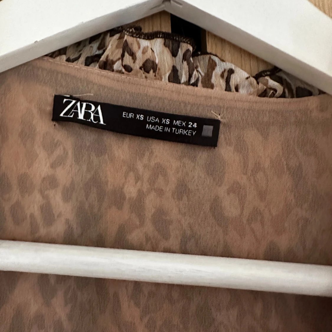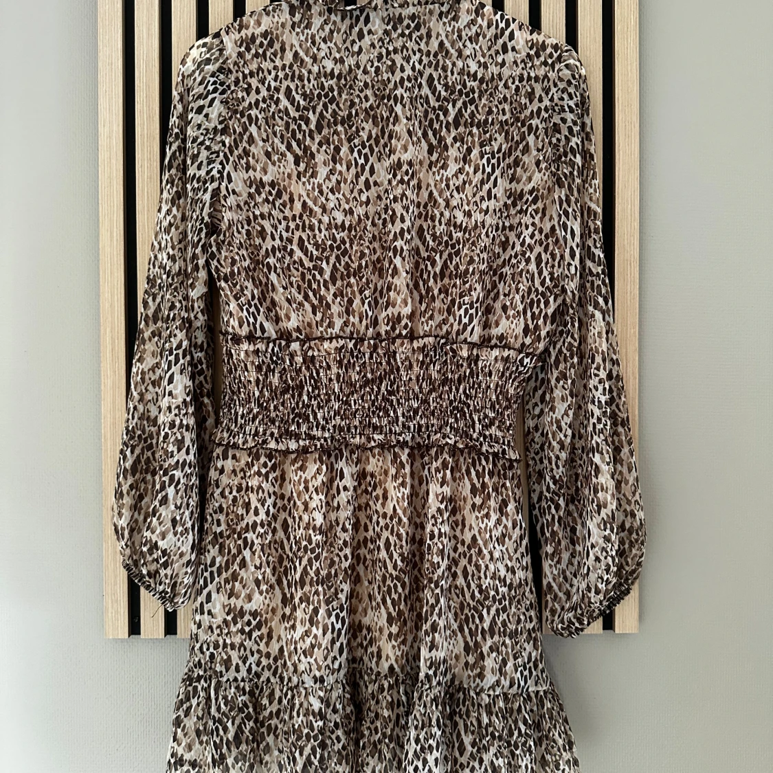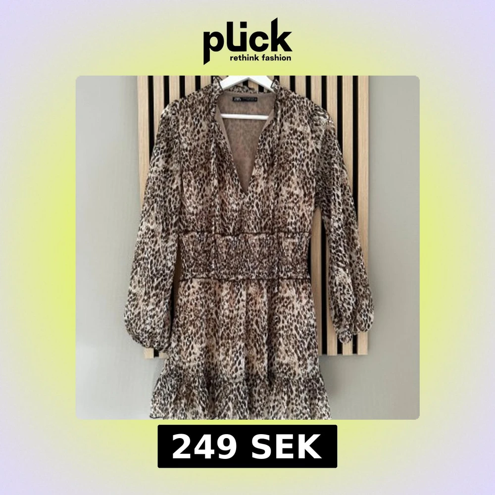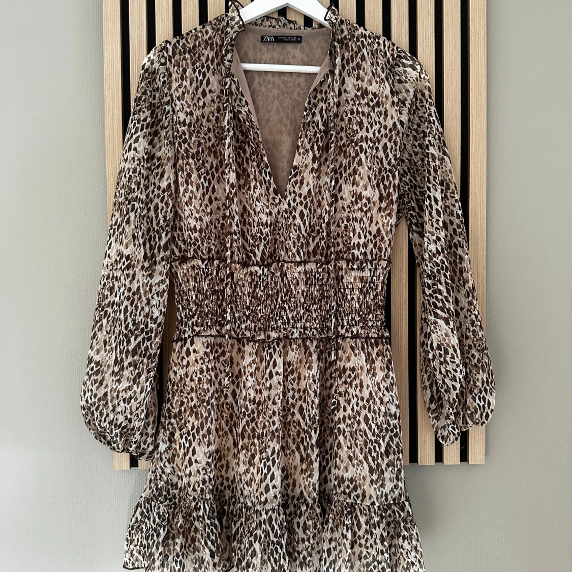 Säljer en snygg kortklänning från Zara i leopardmönster med v-ringning, smockad midja och volang nertill. Klänningen har långa, lätt puffade ärmar och är tillverkad i ett tunt, luftigt material som känns superbekvämt. 💕 Endast använd en gång.