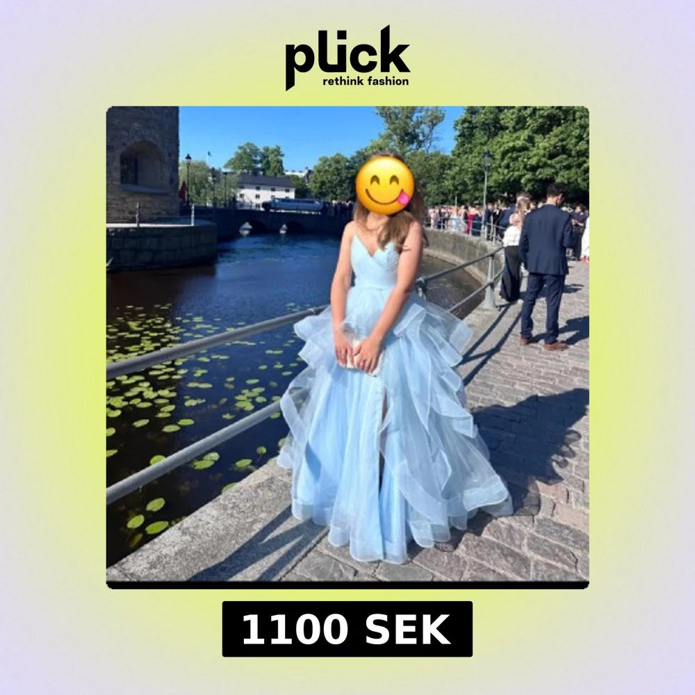 Säljer en drömmig ljusblå långklänning med flera lager volanger och v-ringad överdel. Klänningen har en markerad midja och är ärmlös, perfekt för bal. Materialet är lätt och ger ett svävande intryck. Använd 2 gånger. Skulle säg att den sitter som en S/XS. Finns dragkedja där bak. Jag är ca 167 cm lång. Och hade på mig ballerina skor. Köptes för 2200 men säljer för 1100