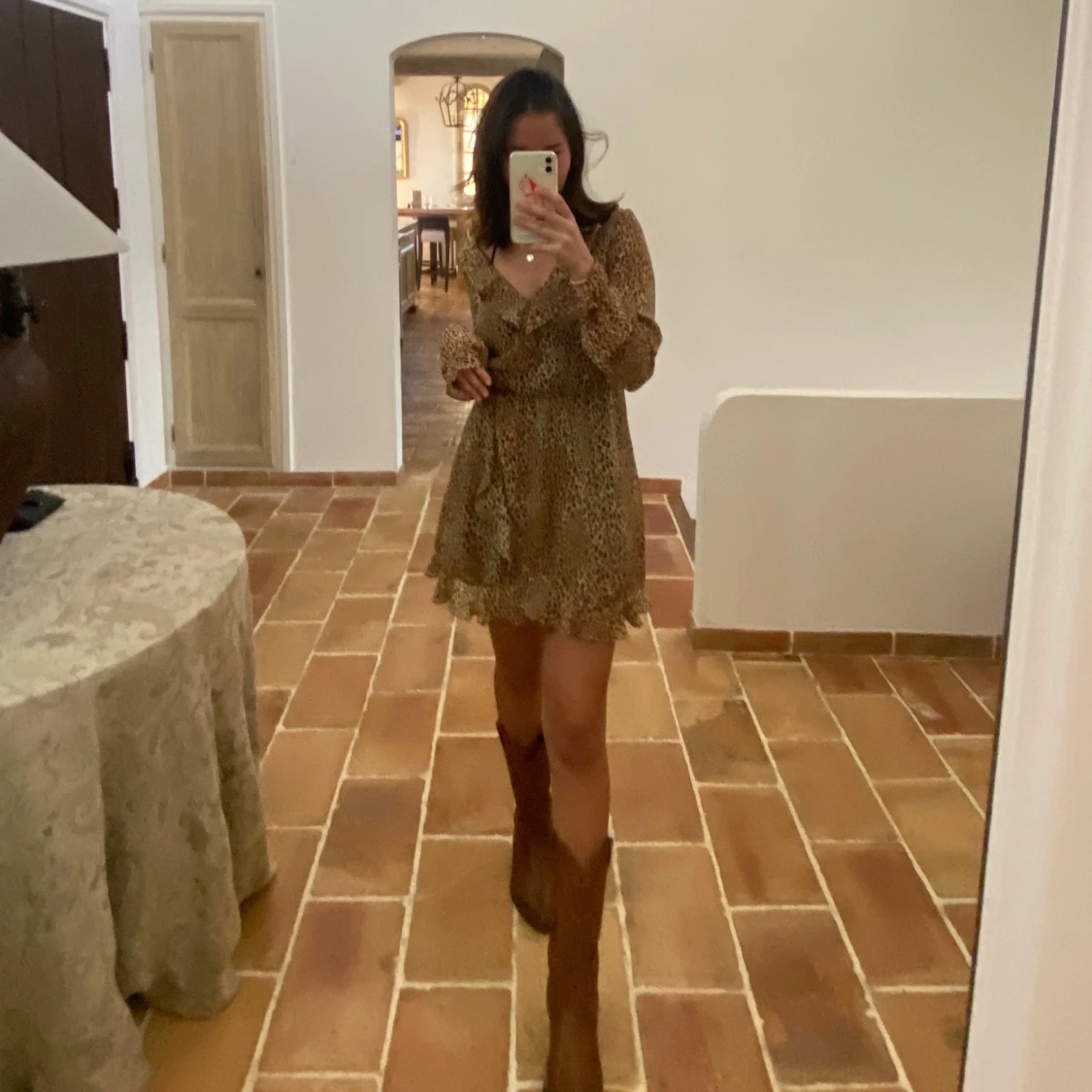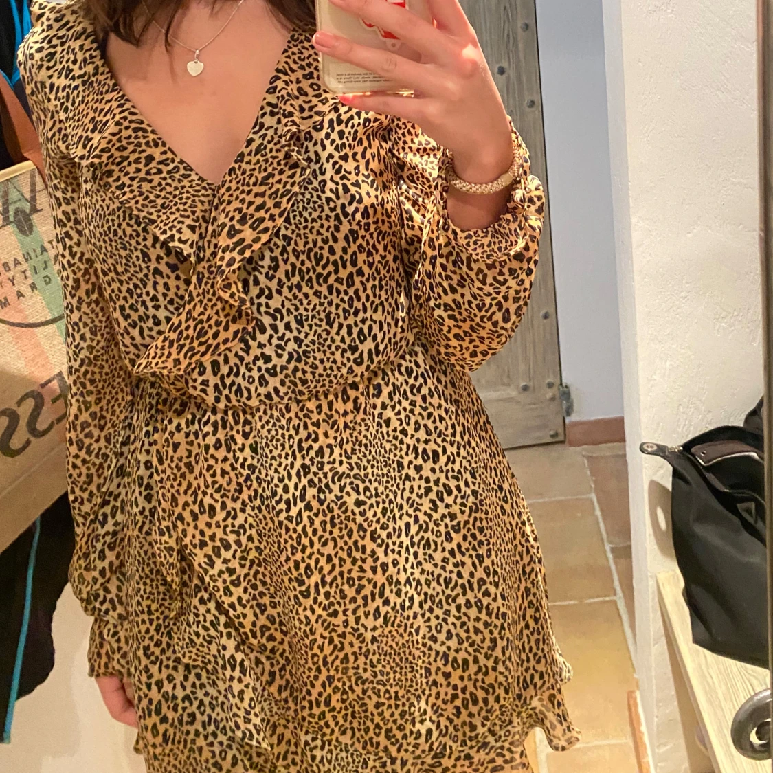 Trendig leopardmönstrad klänning med volangdetaljer och v-ringning. Klänningen har långa ärmar och en kort längd, perfekt för en chic look. Tillverkad i ett lätt och luftigt material som ger en bekväm passform.