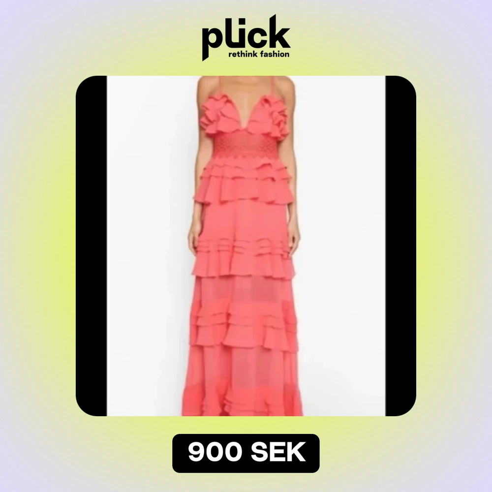 storlek 8, motsvarar 36. Endast använd en gång, i fint skick, lite smutsig längst ner men kan tvättas, och en söm bak har lossnat lite (se bild 3) men jag har sytt ihop det! 🩷en volang är uppsydd, jag är 167 och den är perfekt lång på mig med klackar