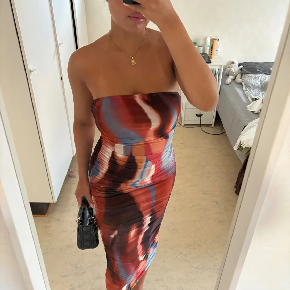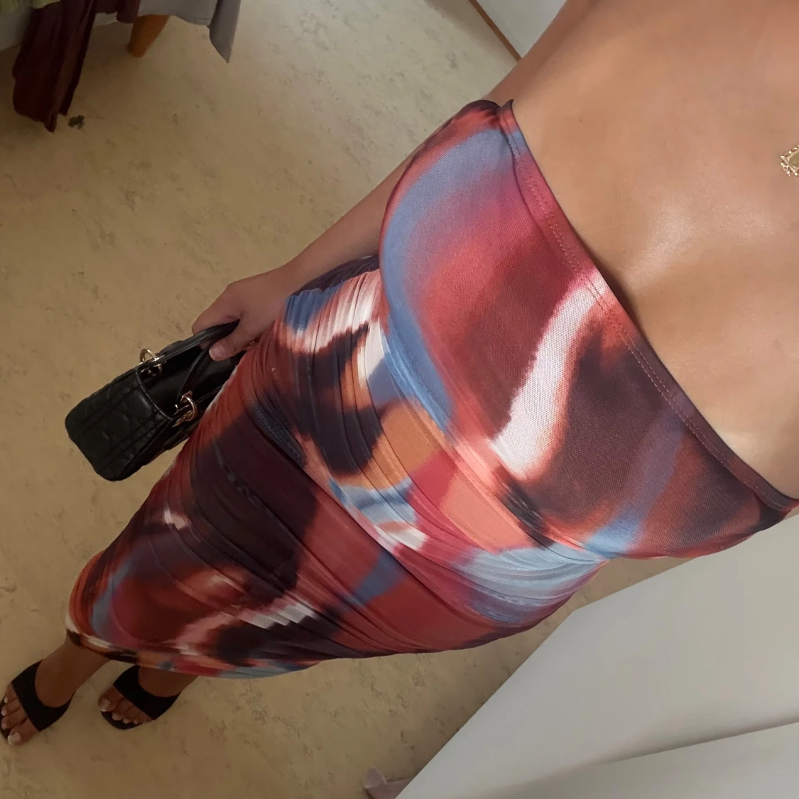 Säljer en snygg axelbandslös tubklänning i midi-längd med abstrakt mönster i rött, blått, vitt och brunt. Klänningen är figurnära och har en tight passform, perfekt för dig som vill sticka ut. Materialet känns stretchigt och följsamt.