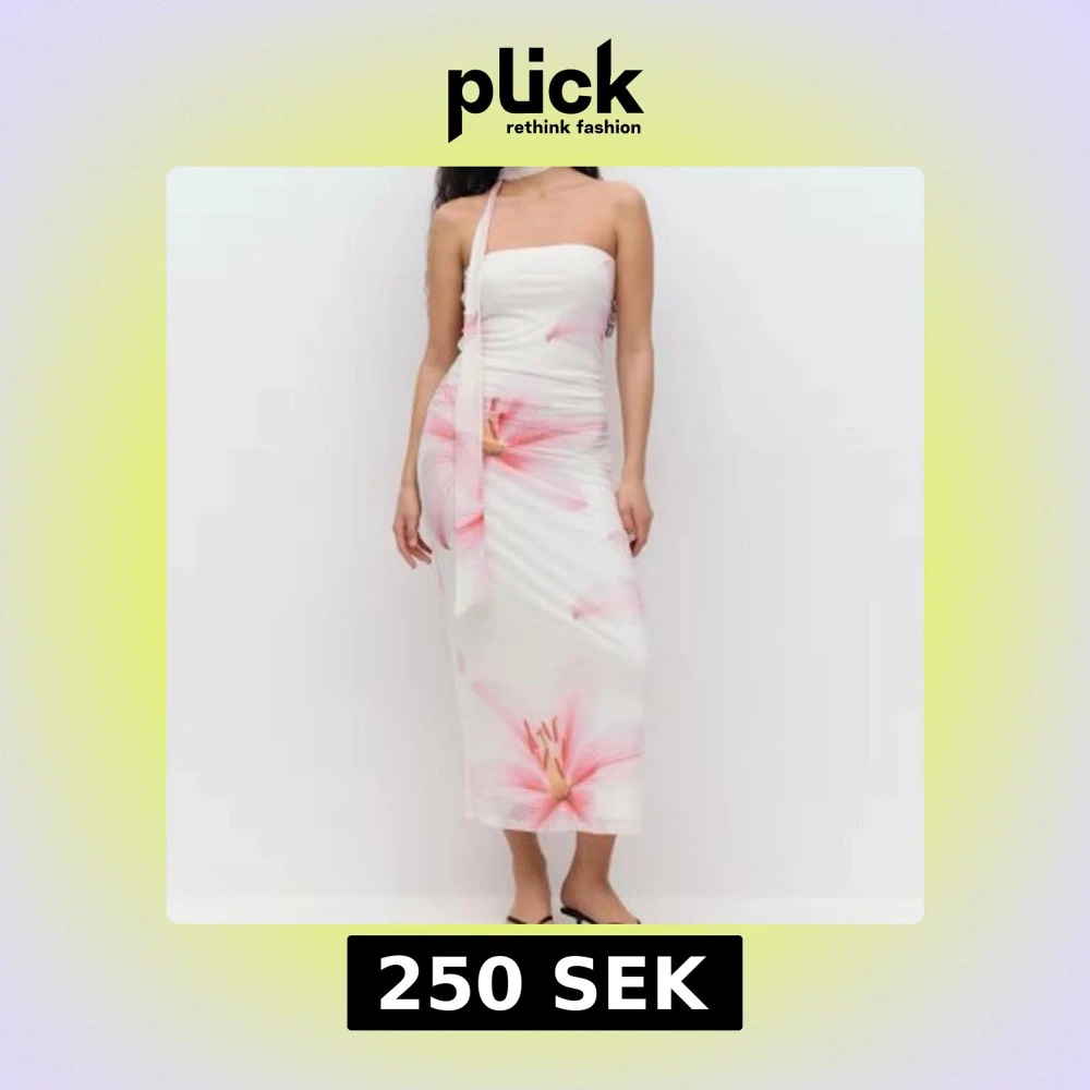 Supersnygg axelbandslös långklänning i vitt med stora rosa blommor och tillhörande scarf. Klänningen har en figurnära passform och är perfekt för sommarens alla tillfällen. Materialet känns lätt och svalt, och mönstret ger en fräsch vibe. ALDRIG ANVÄND
