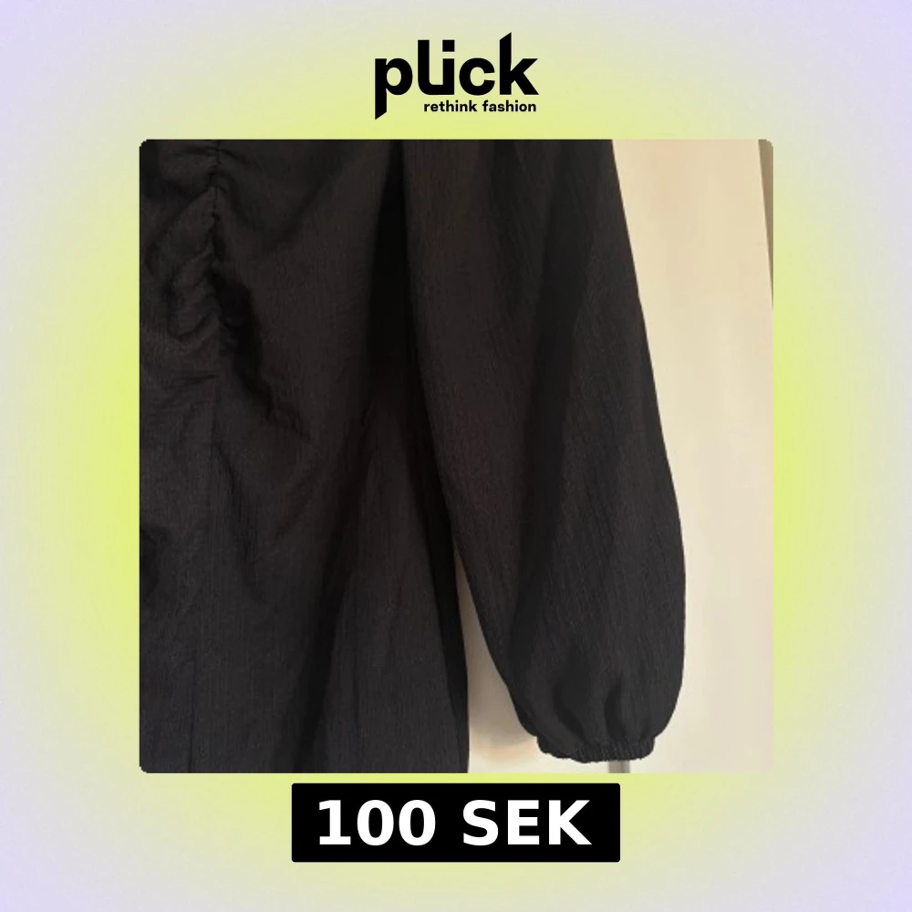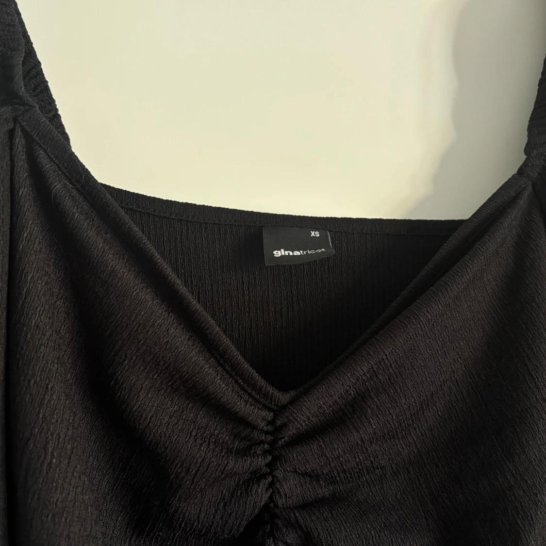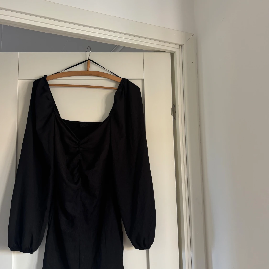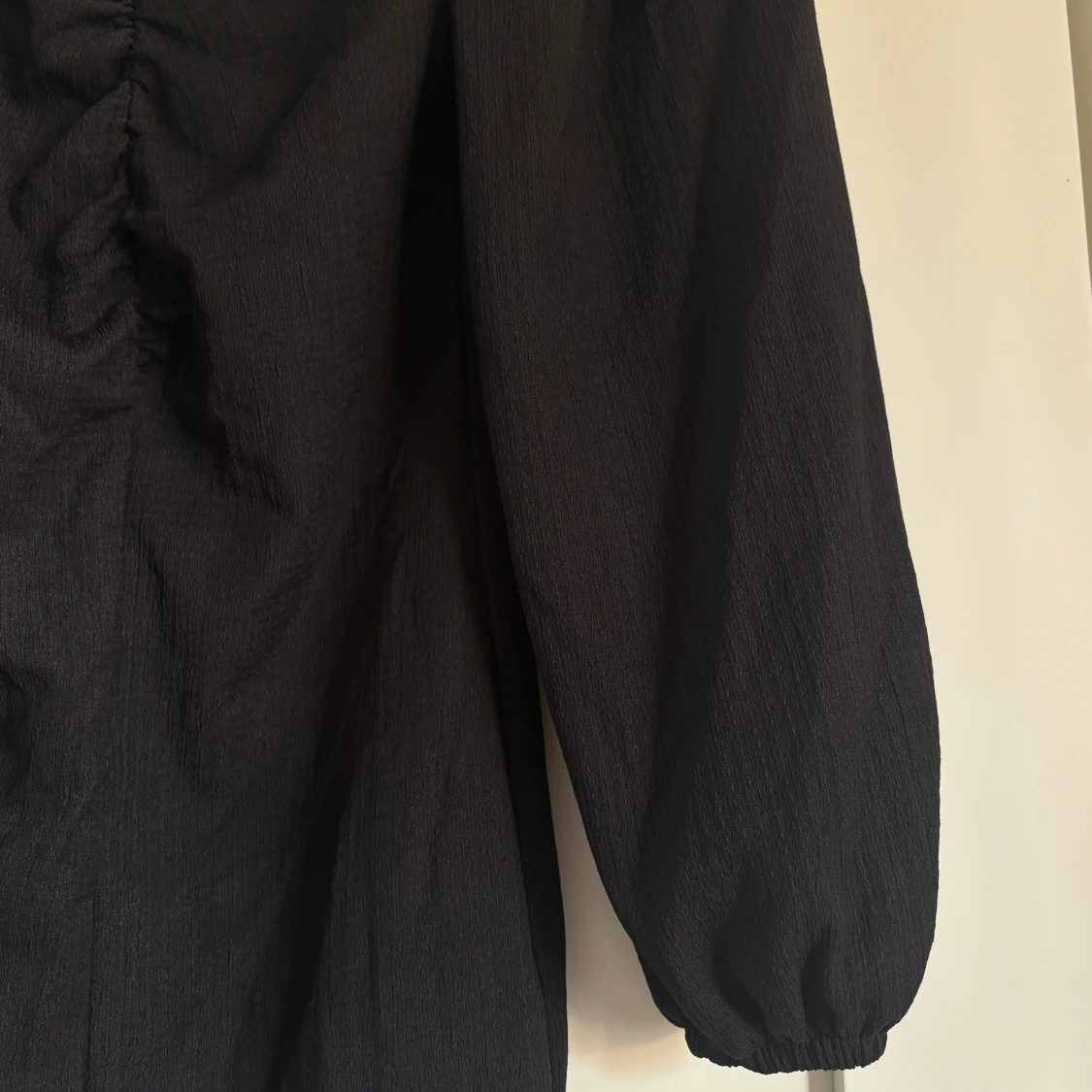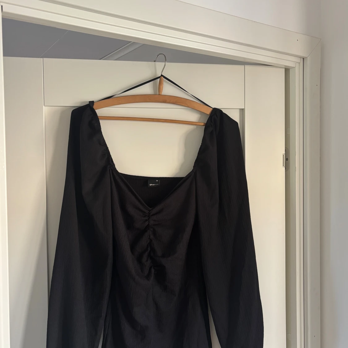 Snygg svart klänning från Gina Tricot i storlek XS. Klänningen har puffiga långärmar, en djup fyrkantig ringning och rynkade detaljer framtill. Materialet är lätt strukturerat och ger en cool vibe. Perfekt till alla årstider. Aldrig använd