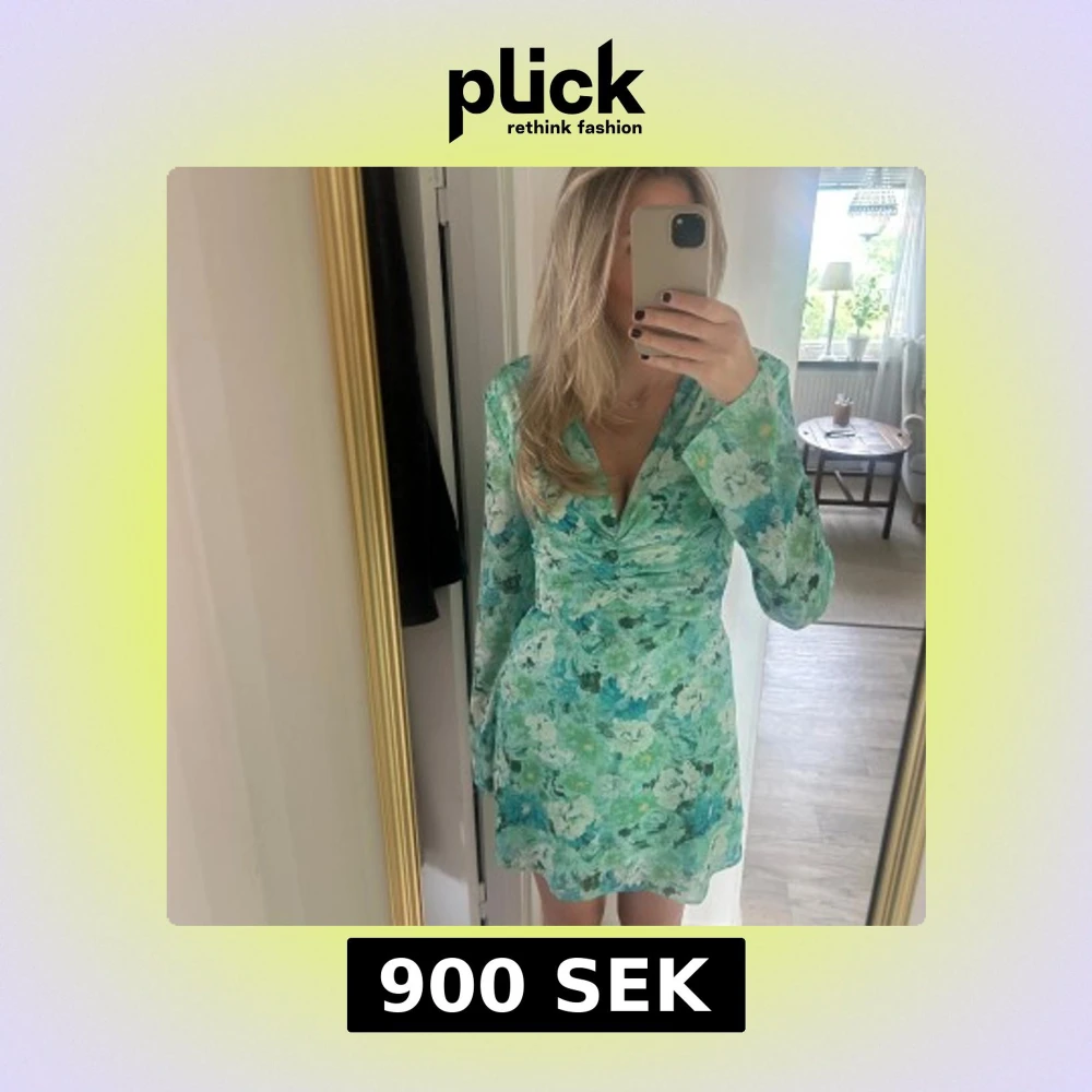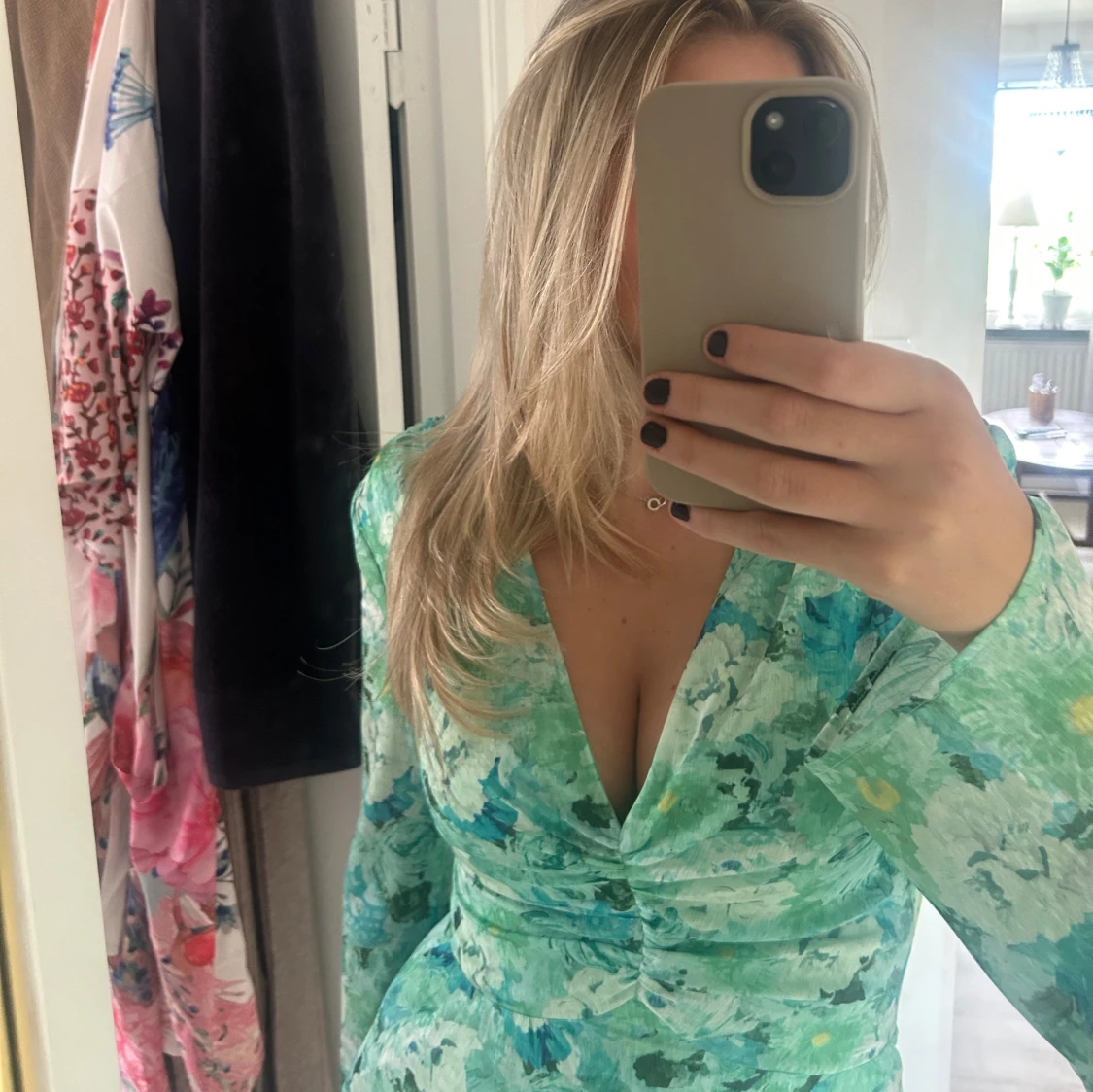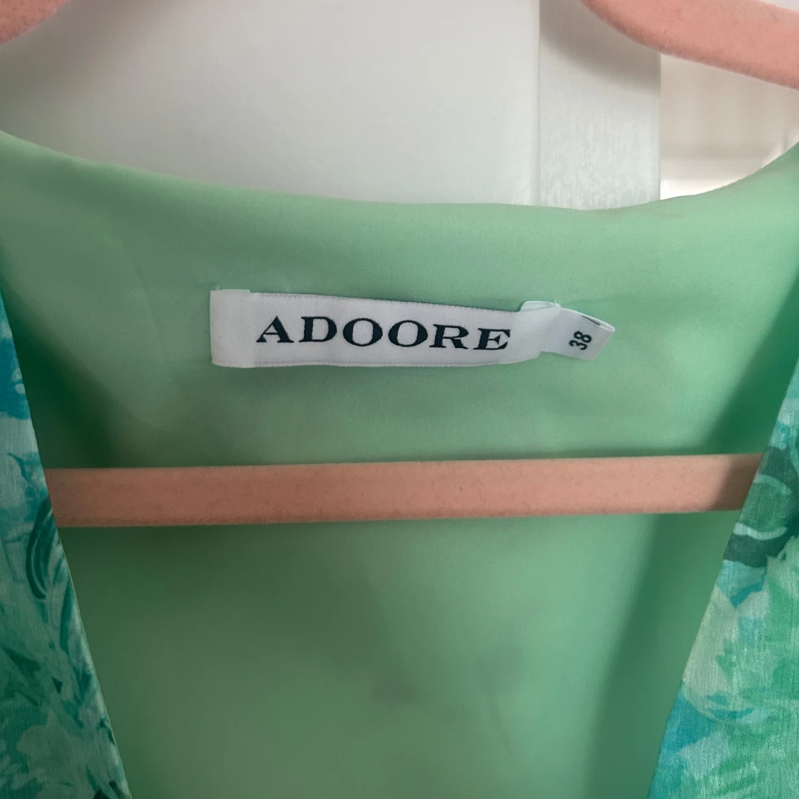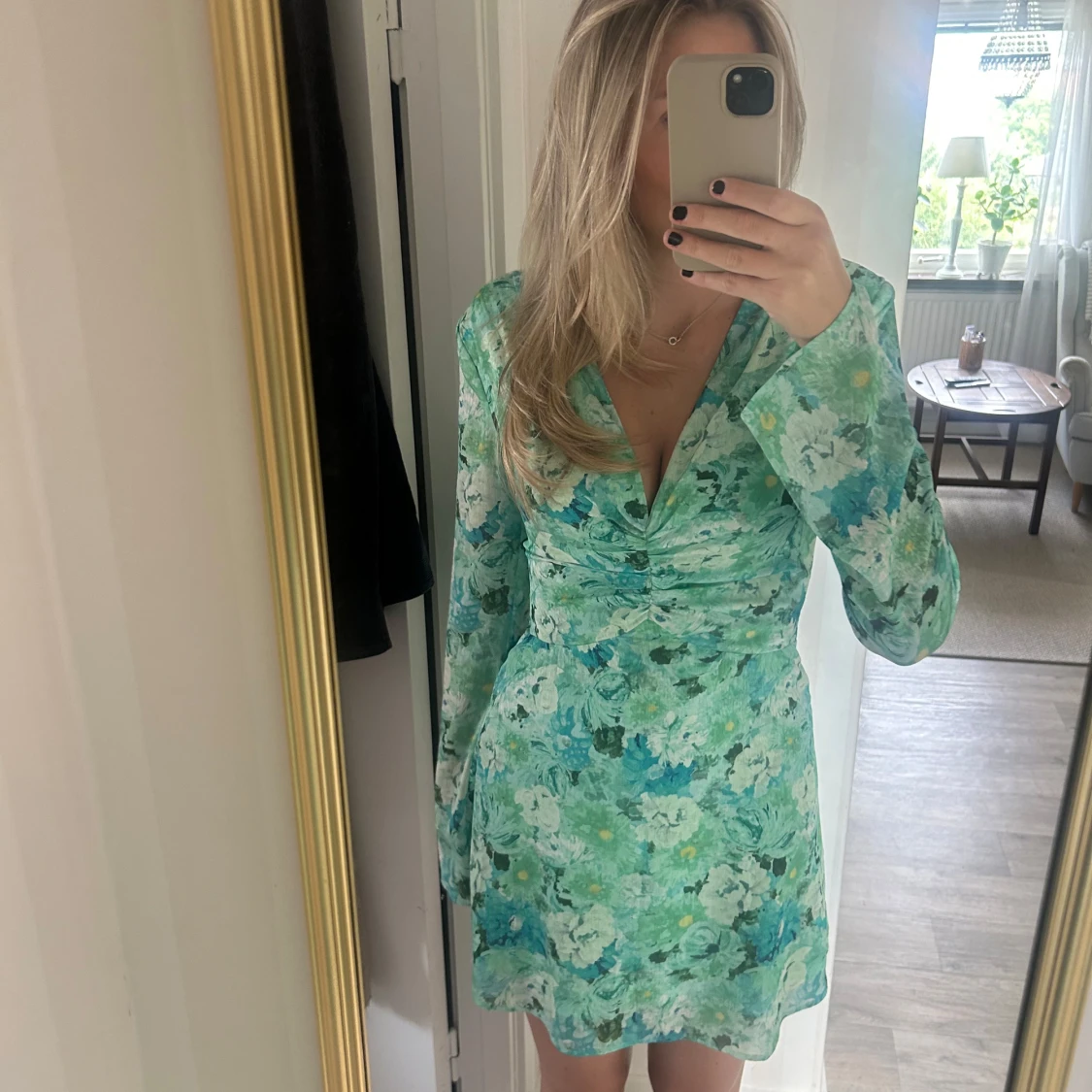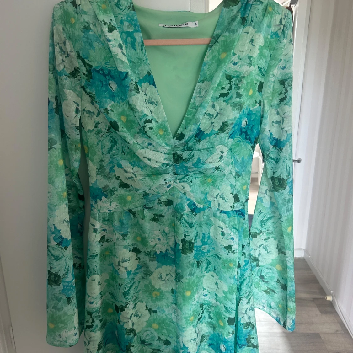 Supersöt kortklänning från Adoore i gröna och turkosa toner med blommigt mönster. Klänningen har långärmade ärmar, v-ringad hals och figurnära midja. Perfekt för dig som vill ha en fräsch och färgglad look i sommar.