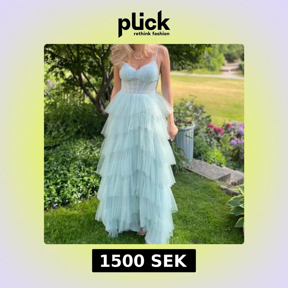 Elegant turkos balklänning med flera lager av volanger och smala axelband. Klänningen har en slits vid ena benet och har en släp designad därav är den längre där bak. Endast använd en gång på balen i 9an förra sommaren. Skriv om du har några frågor! 💞💞