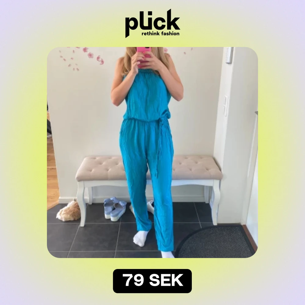 Säljer en snygg turkos byxdress som är perfekt för sommaren. Den har en avslappnad passform med knytband i midjan för att justera passformen. Materialet ser lätt och luftigt ut, vilket gör den idealisk för varma dagar. Perfekt för både vardag och fest! Färgen är mer i petrol i verkligheten