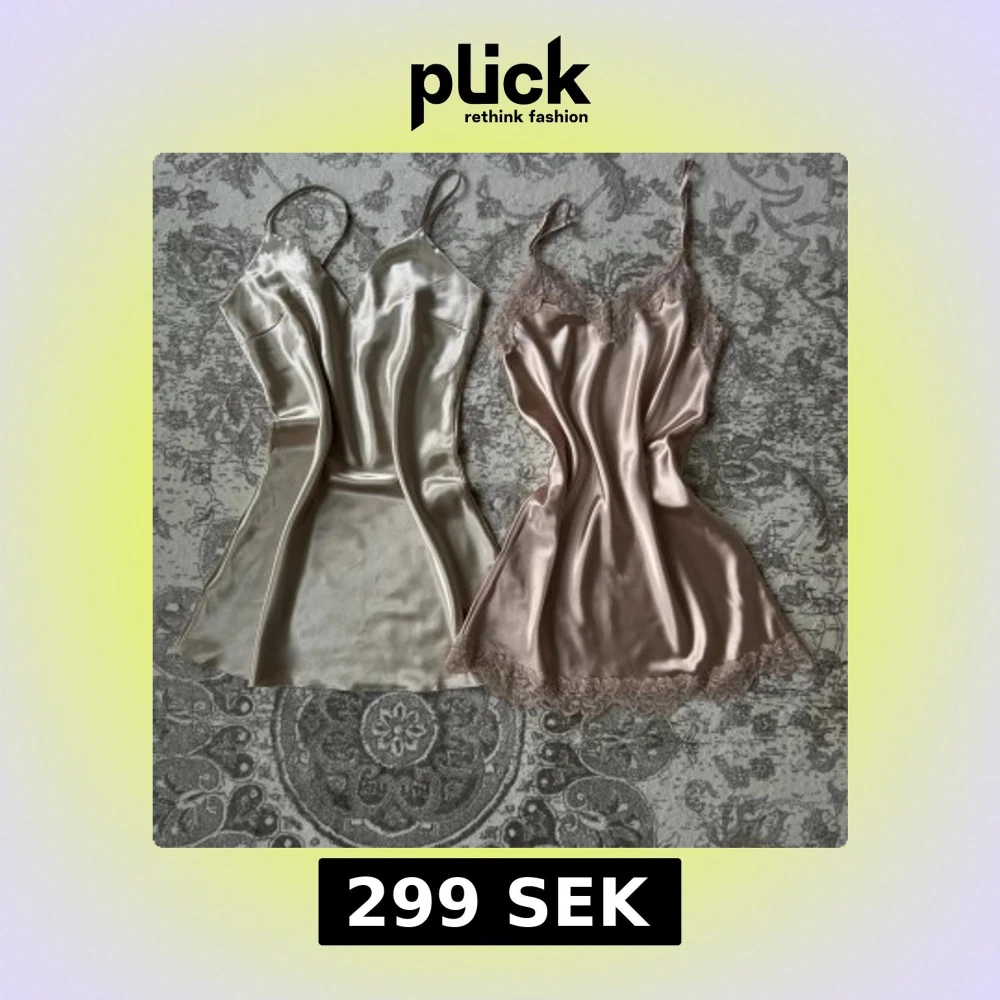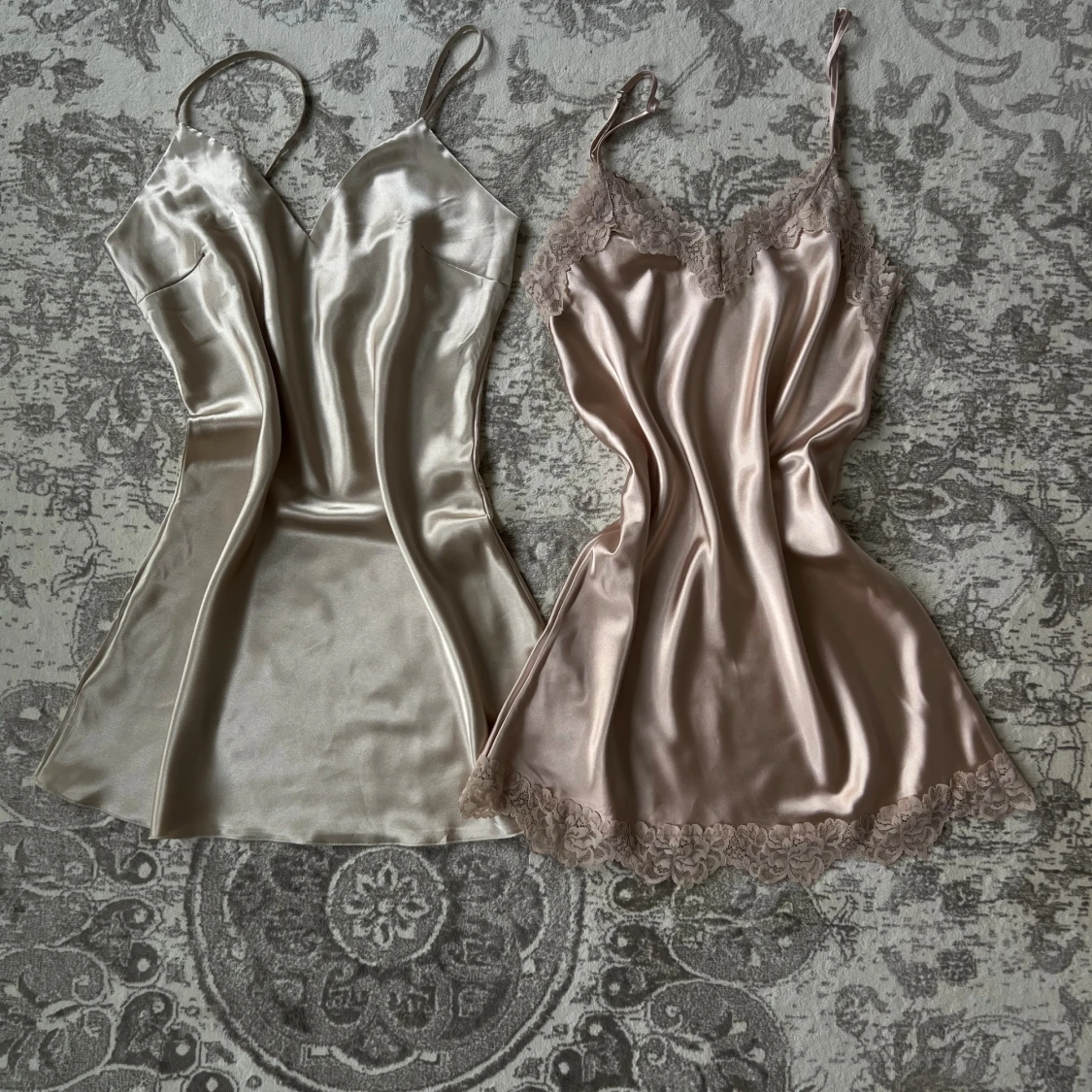 Säljer två korta satinklänningar med smala axelband. Ena klänningen är champagnefärgad och enkel och den andra är ljusrosa med spetsdetaljer vid halsringning och fåll.