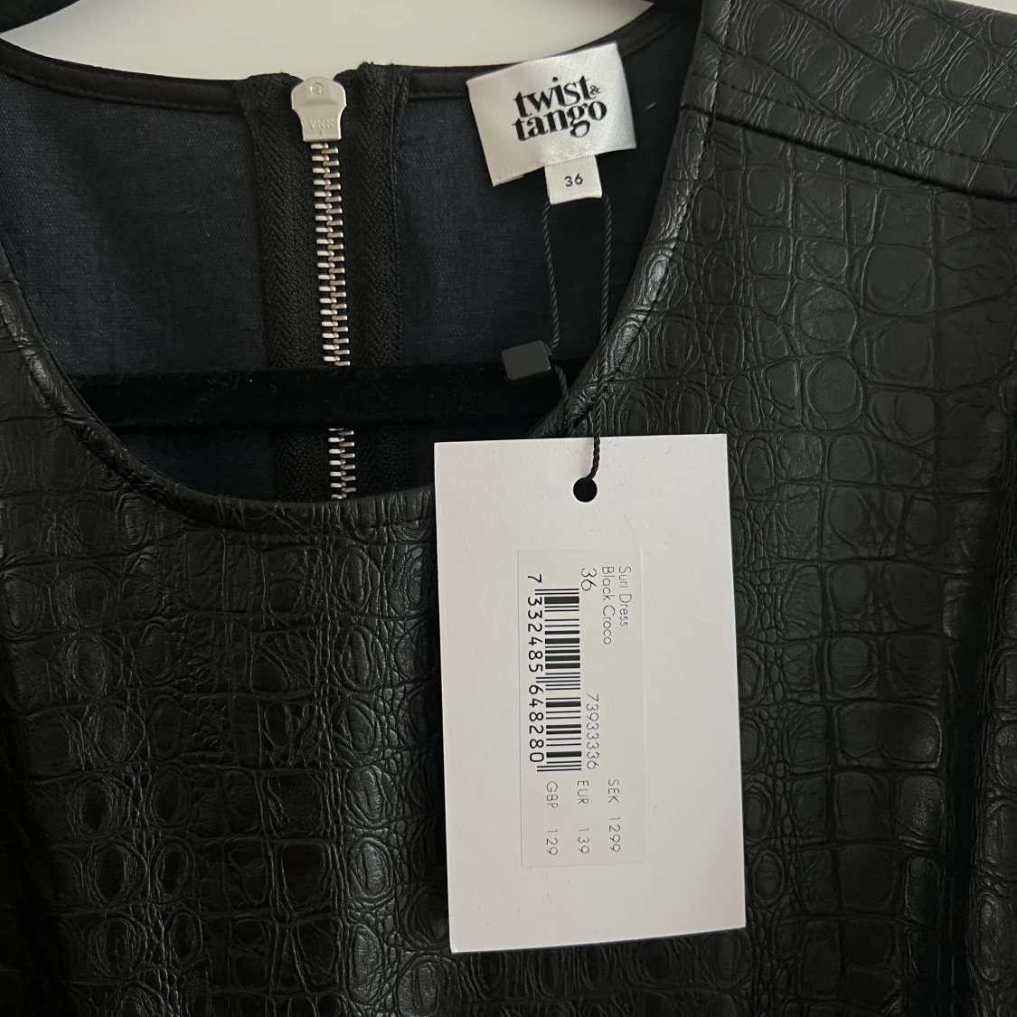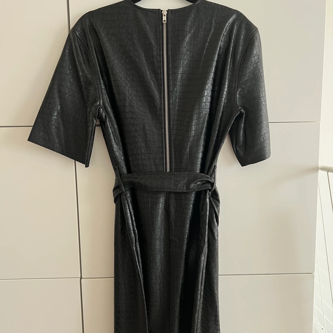 Svart läcker klänning från Twist ang Tango. Storlek: 36 Svart läder klänning med rund hals i präglat krokomönster. Den har en metalldragkedja baktill, korta ärmar och ett metallspänne i midjan. Bältet är avtagbart för en rak passform. (Klänningen är gjord av veganskt läder) Aldrig använd + prislappen sitter kvar.