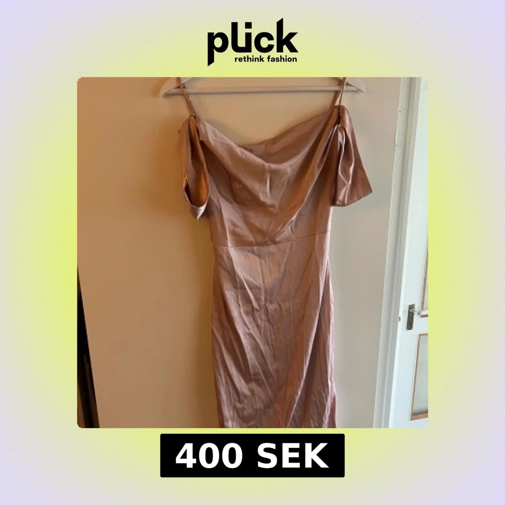 Säljer en elegant långklänning från Oh Polly i champagnefärgad satin. Klänningen har offshoulder-design med draperad halsringning och smala axelband. Materialet är glansigt och mjukt, vilket ger en lyxig känsla. Perfekt för dig som vill sticka ut med stil.