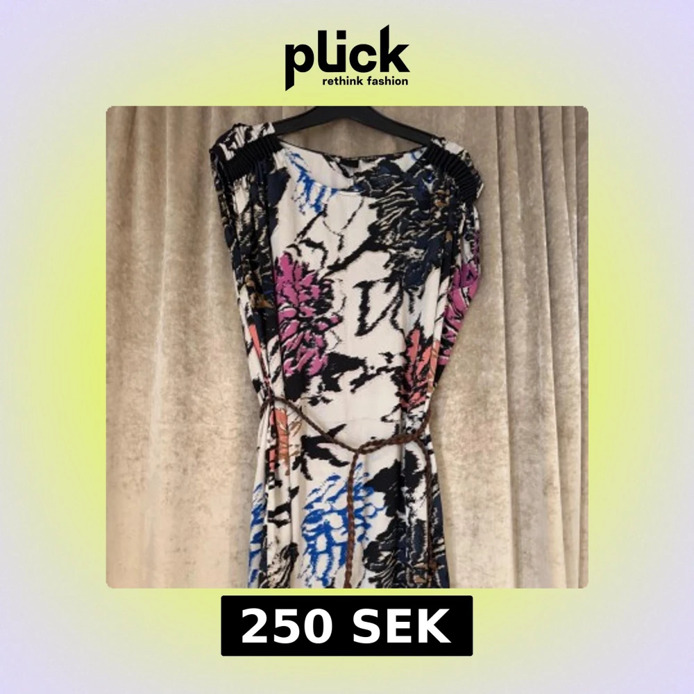 Snygg miniklänning från InWear med blommigt mönster i svart, blått, rosa och beige på ljus botten. Klänningen har lös passform, korta ärmar och ett flätat bälte i midjan. Perfekt för dig som gillar färg och mönster!