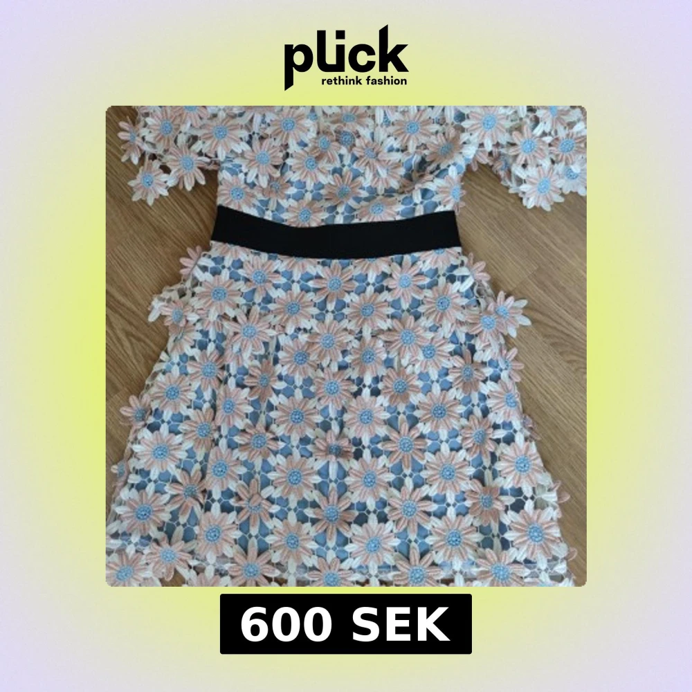 Superfin kortklänning från Self-Portrait med 3D-blommor i pastellrosa, vitt och ljusblått. Klänningen har markerad midja med svart bälte, halvtransparent blommig spets och korta ärmar. Perfekt för dig som vill sticka ut med en unik look!
