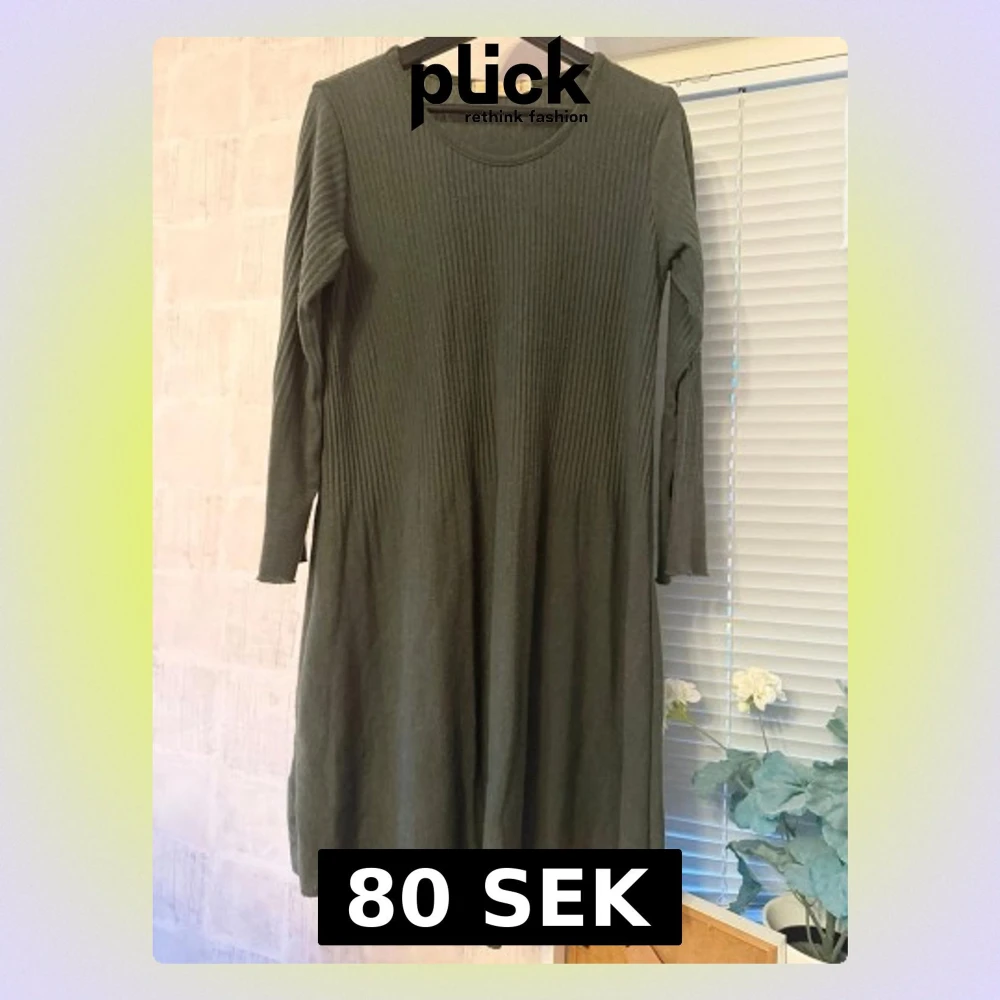 Klänningen är i en djup mörkgrön nyans och har en smickrande ribbstickad textur upptill som övergår i ett mjukt fall. Stretchigt material. Storlek: L/XL (flexibel passform tack vare stretchen) Längd: ca 93 cm Material: 60% viskos, 35% ull, 5% elastan Skick: Klänningen är något nopprig (se bilder), men i övrigt i fint skick. Nopporna går enkelt att åtgärda med en noppborttagare.