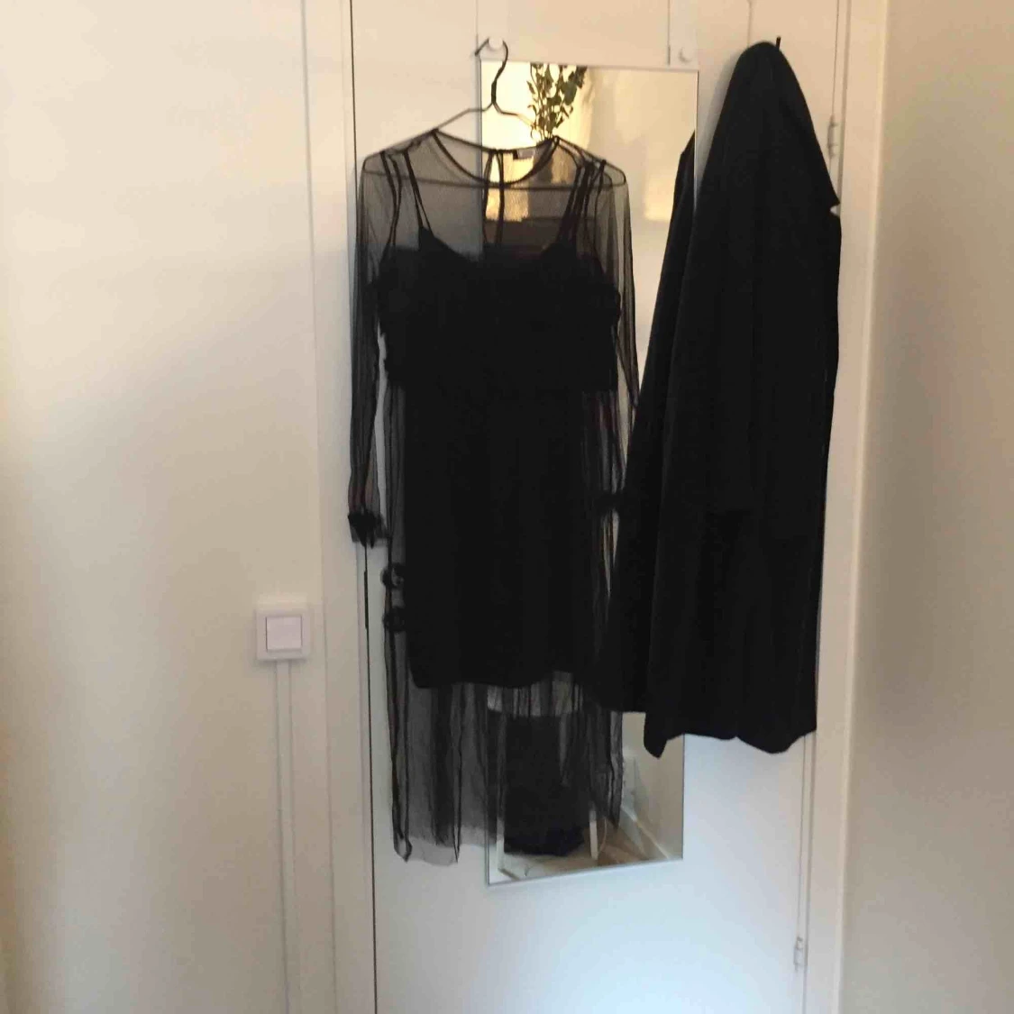 svart supercool klänning i fisknätsmönstrad mesh och inkluderad underklänning. volanger vid byst och ärmslut. endast använd två ggr, perfekt skick.