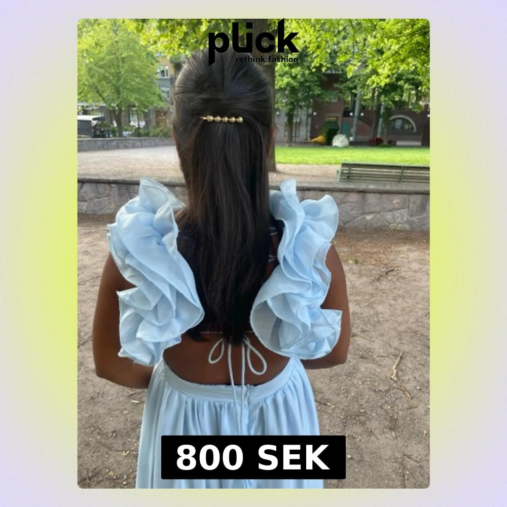 Säljer en ljusblå långklänning med volangaxelband och v-ringning. Klänningen har öppen rygg med knytband och volang i kjolen. Perfekt för 9:ans bal eller student och längden passar om du är ca 1.60 cm.