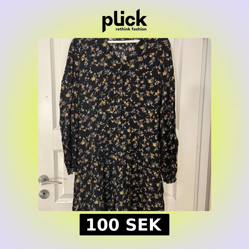 Säljer en svart klänning med ett fint blommigt mönster i gult och blått. Klänningen har långa ärmar och knappar framtill. Svart underklänning hör till. Aldrig använd.