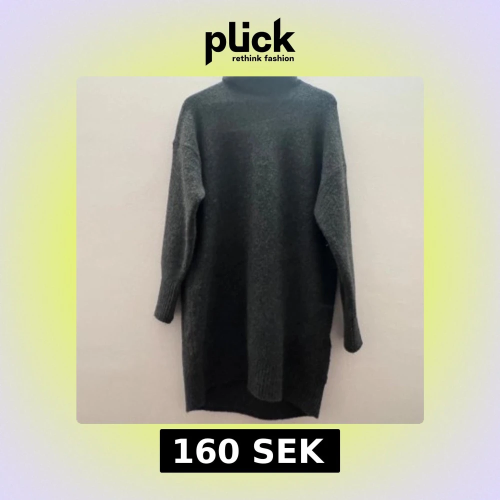 Säljer en mysig grå stickad kläning med långa ärmar. Perfekt för kyliga dagar med sin höga krage och mjuka material. klänningen har en avslappnad passform och ribbade detaljer vid ärmslut och nederkant.
