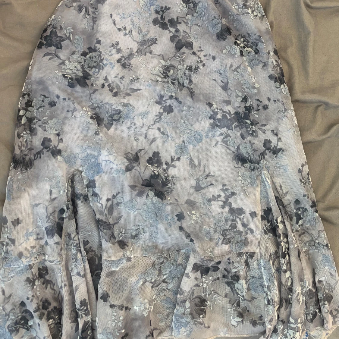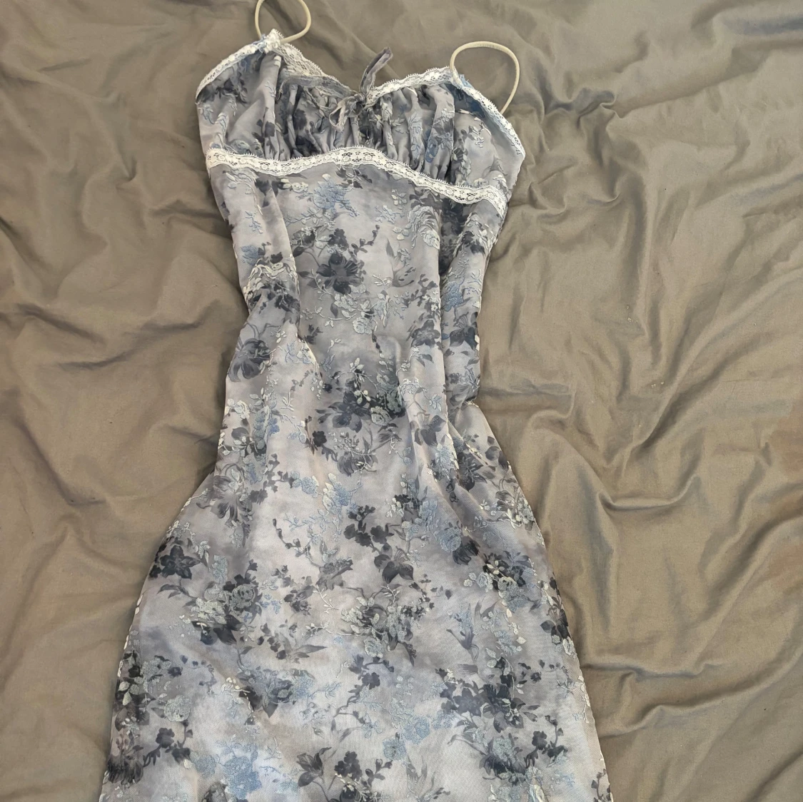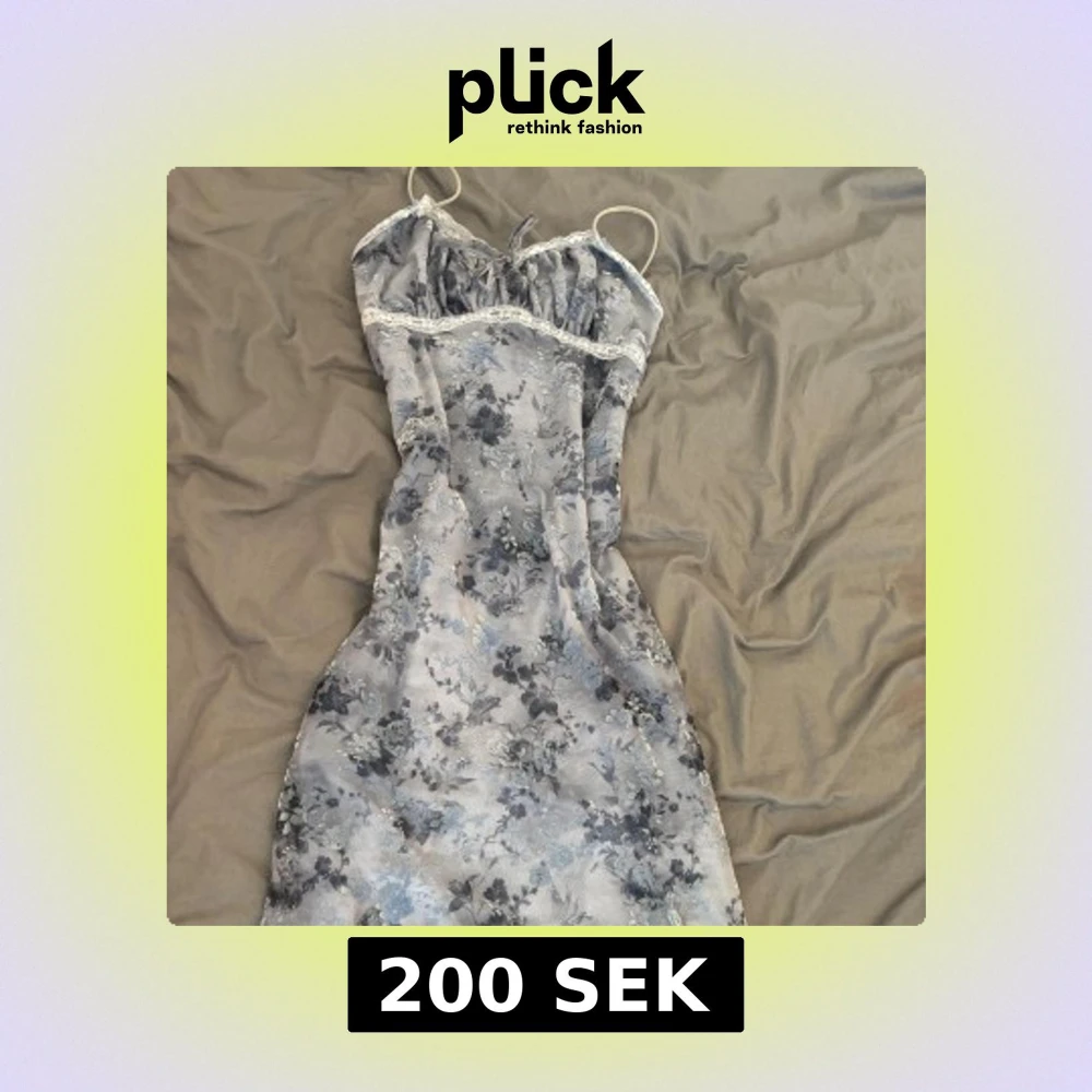 Säljer en romantisk långklänning med blommigt mönster i blå och grå toner från urban outfitters. Klänningen har smala axelband, söt spetskant och snörning vid bysten. Materialet känns lätt och flowy, perfekt för sommarkvällar. Slitsar nertill ger extra rörelse och stil. Står inte vilken storlek det är men jag skulle säga att den passar någon med storlek S.