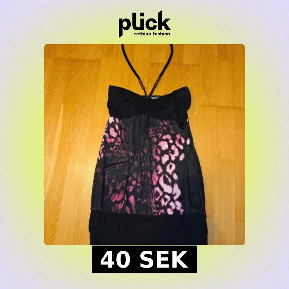 Snygg svart kort klänning med rosa leopardmönster och tunna halterneckband med träpärlor. Klänningen har en ärmlös design, perfekt för dig som vill sticka ut. Materialet känns mjukt och följsamt. Den är köpt utomlands och har ingen storlek, men skulle uppskatta den till Medium.