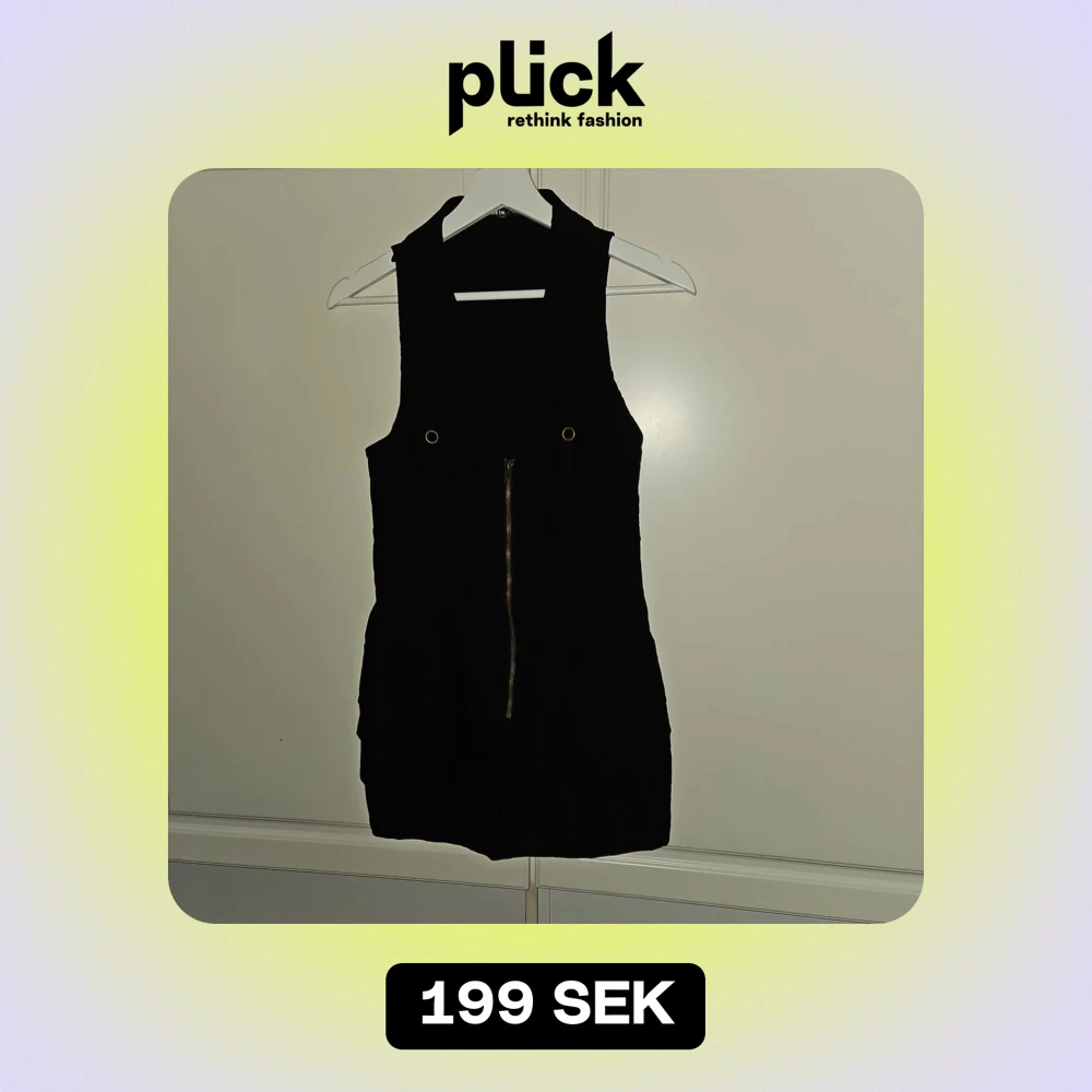 Nytt Svart klänning med guldfärgad dragkedja framtill och två fickor framtill Klänningen är utan ärmar och har en v-ringning . Hällor för att kunna ha skärp I Längd 78 cm
