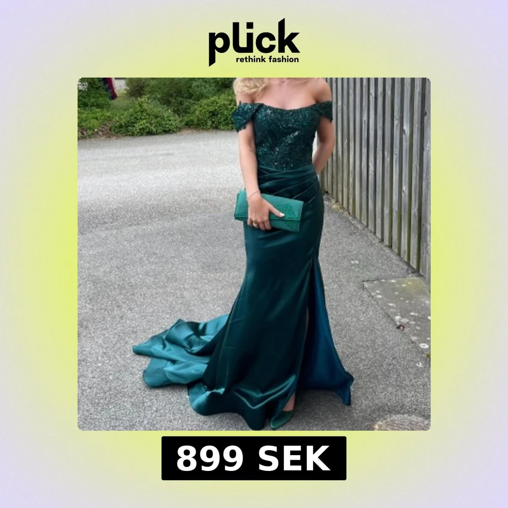 Elegant mörkgrön långklänning med offshoulder och vacker spets upptill. Klänningen har en figurnära passform, slits framtill och draperad midja. Perfekt för bal eller fest. Köpt för 1770kr på hebeos!
