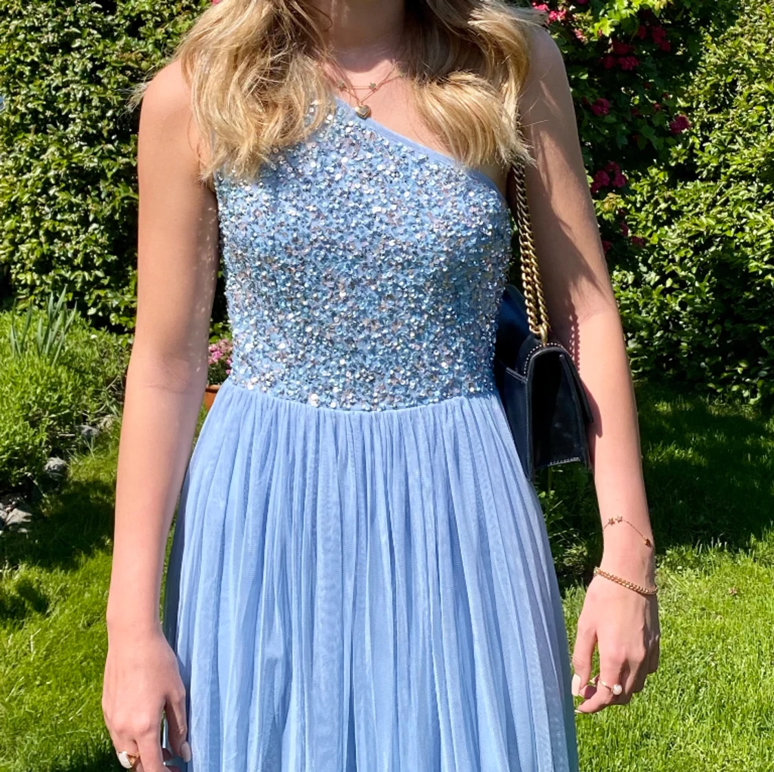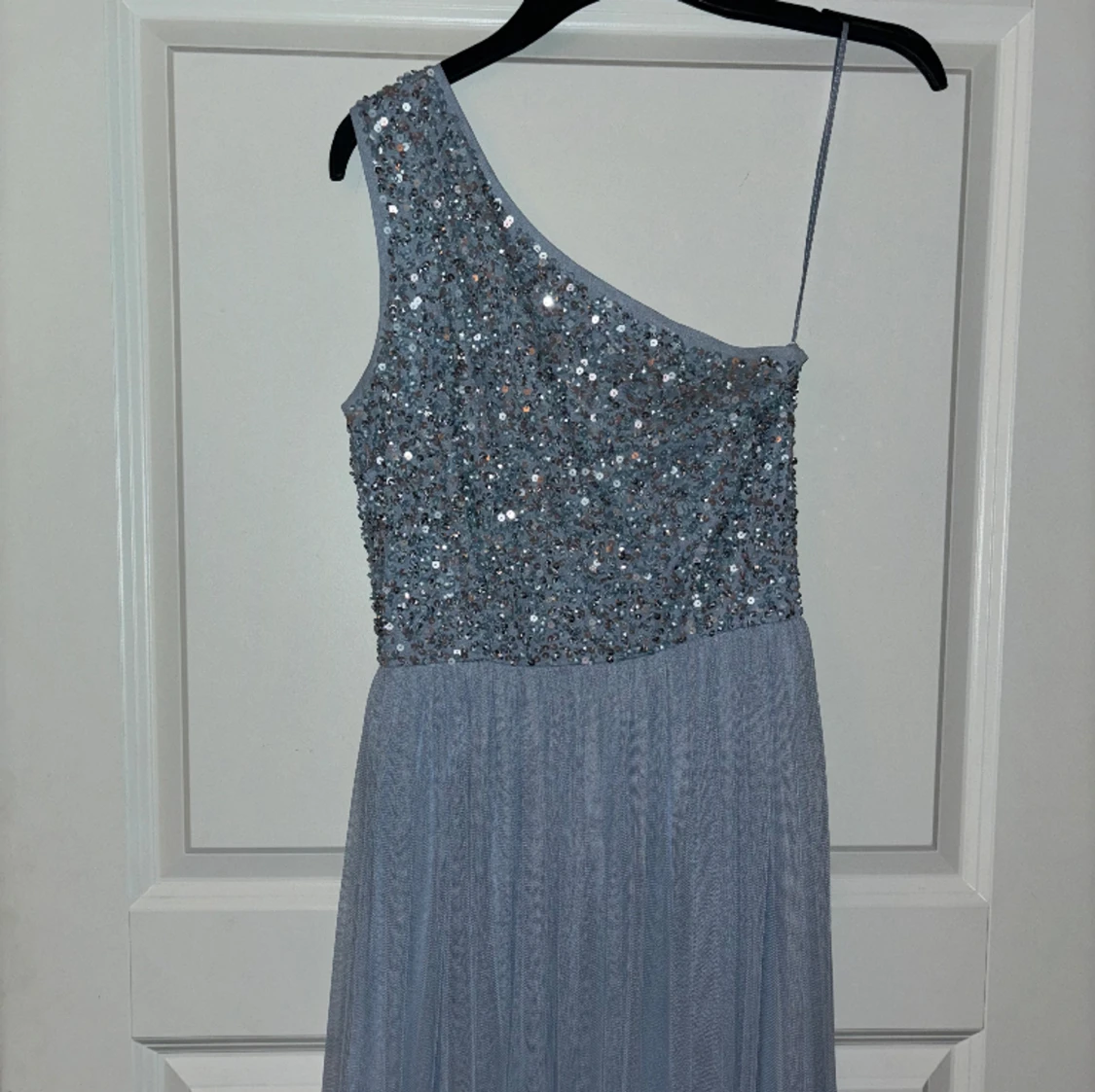 Köpte denna klänning från Zalando 2021 till min bal . Den är ändast använd en gång och i väldigt gott skick. Första bilden visar klänningens färg bäst , klänningen är one sholder vilket visas på andra bilden.💕