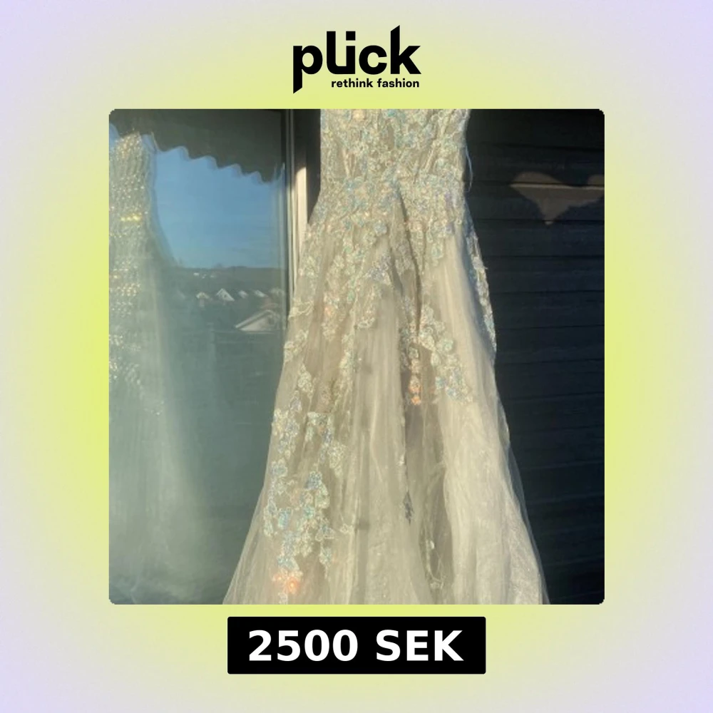 Magisk ljusgrön långklänning med v-ringning och vackra blommiga spetsdetaljer i grönt och silver. Klänningen har glittrande paljetter och ett skirt, svepande tyg som ger en drömmig känsla. Perfekt för bal eller festliga tillfällen. Använd en gång, skriv om du har frågor kan gå ner i pris vid snabb affär