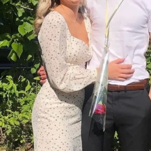 En créme vit klänning med små svarta blommor på. Går ungefär en decimeter över mina knän. Jag är 167 cm lång. Första bilden är lånad dom andra från en video så därför inte så bra kvalitet.