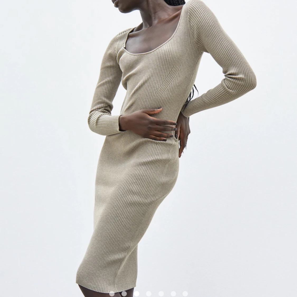 Stickad mid-klänning ifrån H&M i sådant otroligt skönt tyg. Den formar kroppen superfint och är lite tjockare, perfekt nu på vintern! Använd 1 gång och säljes pga har en svart jag använder mer!
