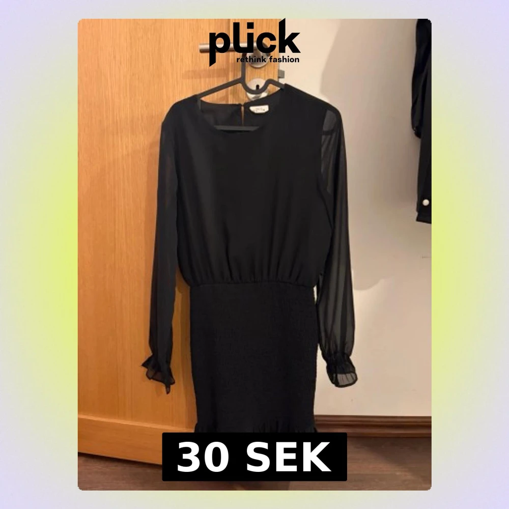 Svart kort klänning från Vero Moda med transparenta långärmar och rund halsringning. Kjolen är smockad och avslutas med en volangkant. Perfekt för dig som gillar en enkel men elegant stil.
