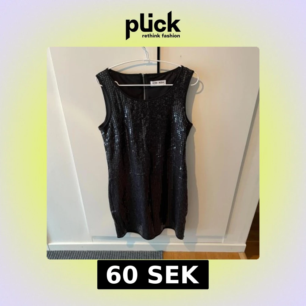 Snygg svart glittrig klänning från Vero Moda i storlek 38. Klänningen är ärmlös med en dragkedja i ryggen och har en elegant, glittrig yta som passar perfekt för festliga tillfällen.
